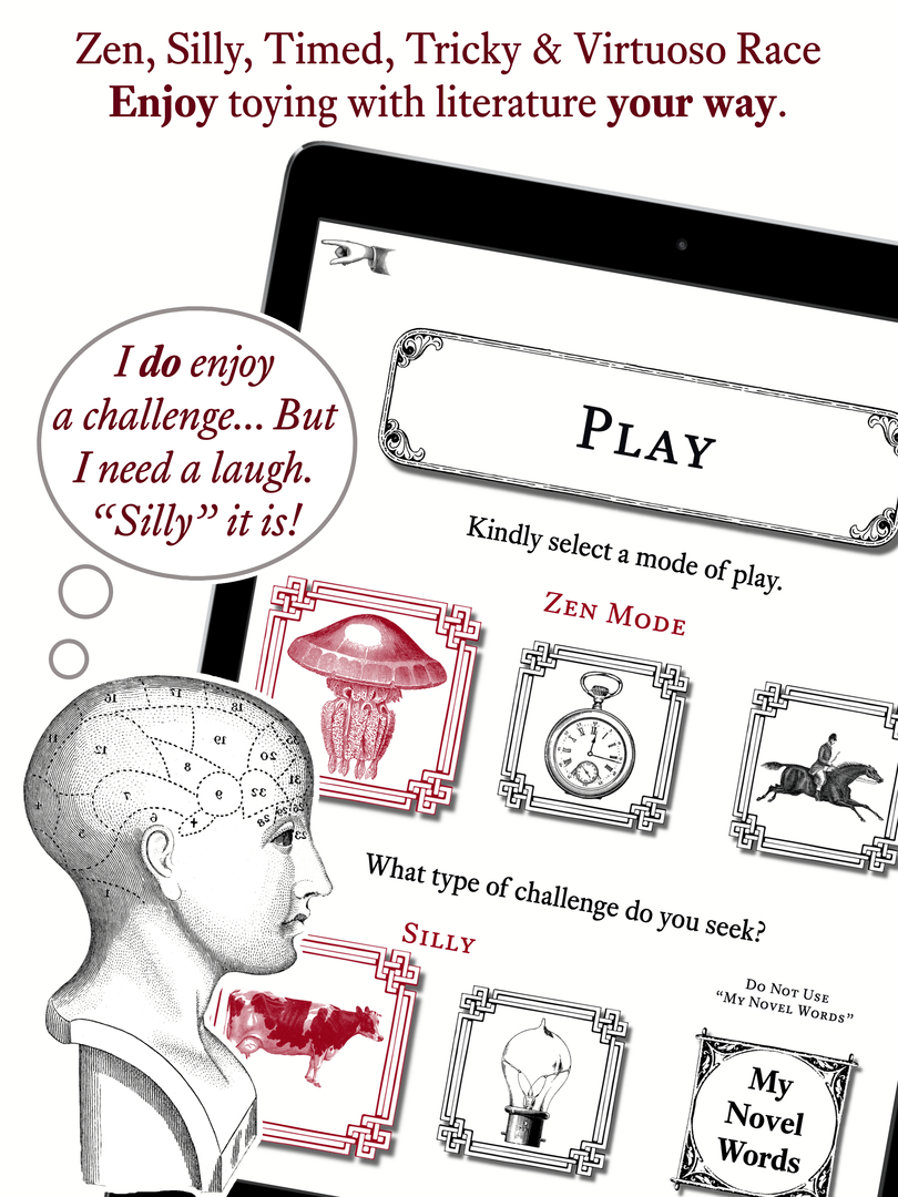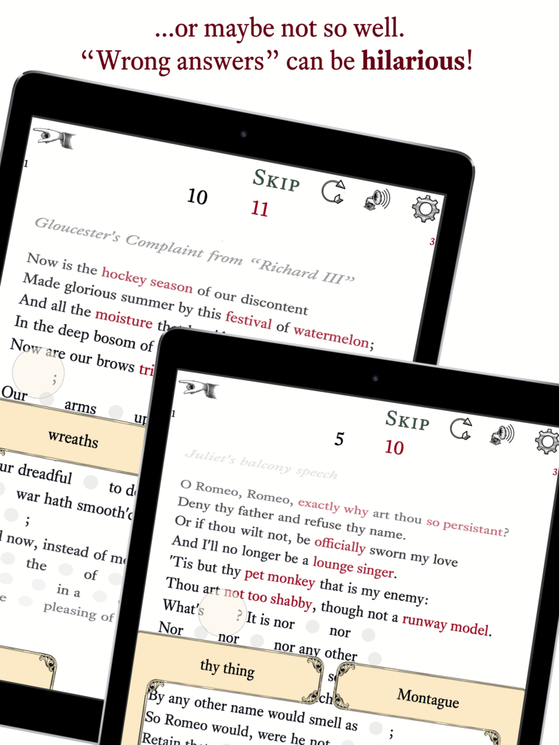 Nursery rhymes, tongue twisters, proverbs, great prose and poetry. These timeless texts are missing words. Tap the author's word and feel clever. Don’t know it? Don’t sweat it! Our ”Wrong answers” are usually pretty funny. Now you can even add your own! Nearly 5,000 timeless words in 50 playable texts with over 1,500 missing words and 15,000 hand-crafted Novel alternatives to select...or avoid.