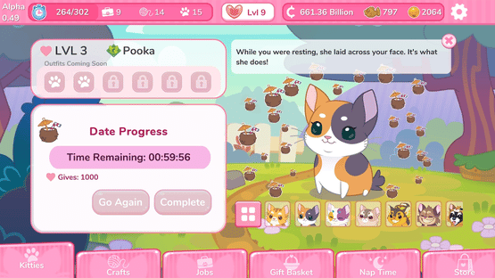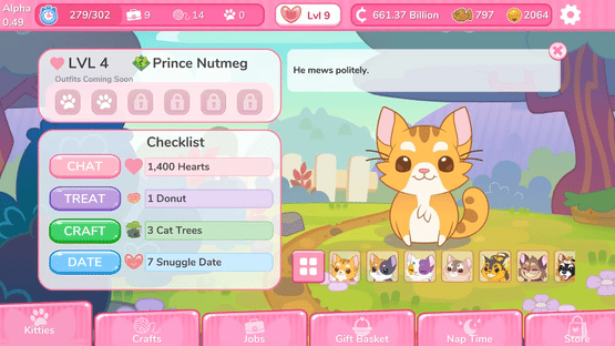 Kitty Catsanova is the premier Idle Cat Dating Sim! Collect adorable kitties and win their hearts by taking them out on lavish dates, crafting exquisite gifts, and buying them wondrous presents. Manage your time carefully, since you don't want any kitties to get lonely!