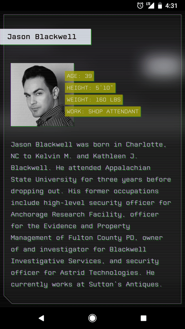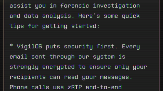 Use VigilOS, an advanced operating system used by detectives, investigators, and secret agents all over the world, to investigate suspects, send emails and texts, make phone calls, hack into companies, and crack codes as you work to solve the mystery surrounding a man's disappearance.