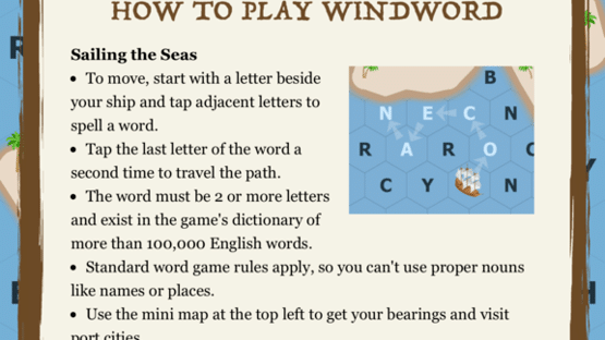 Sail a sea of words to trade goods, battle pirates, build a fortune, and find the treasure! In WindWord, you use words instead of wind to sail your ship from one port to the next. You can buy and sell goods at each port to earn money. If you find good (long) words you can sail fast enough to avoid pirates. But if not, you can always battle the pirates to take their gold. Visit all of the ports to upgrade your ship, buy more cannons, and get pieces of an ancient treasure map to win the game. WindWord is endlessly replayable as each game features a randomly-generated map of the seas with islands, ports and words. Each game is a new adventure. See how fast you can build up your rank, earn money and find the treasure. Advance from "Swabbie" to "Commodore!" Be sure to read through the bullet-list how-to guide for all sorts of helpful tips and hidden game features!