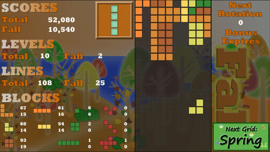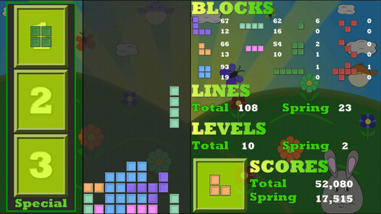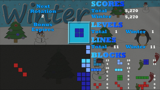 Whirlygig is a block building game which consists of 4 unique grids - Fall, Winter, Spring, and Summer. Blocks move upward in Fall, to the right in Winter, downward in Spring, and to the left in Summer. Every 5 turns, a new grid is randomly selected as the next grid to play in. Game level, speed, and scores increase as you destroy more rows of blocks. Build and destroy until the Whirlygig becomes too fast to handle.
