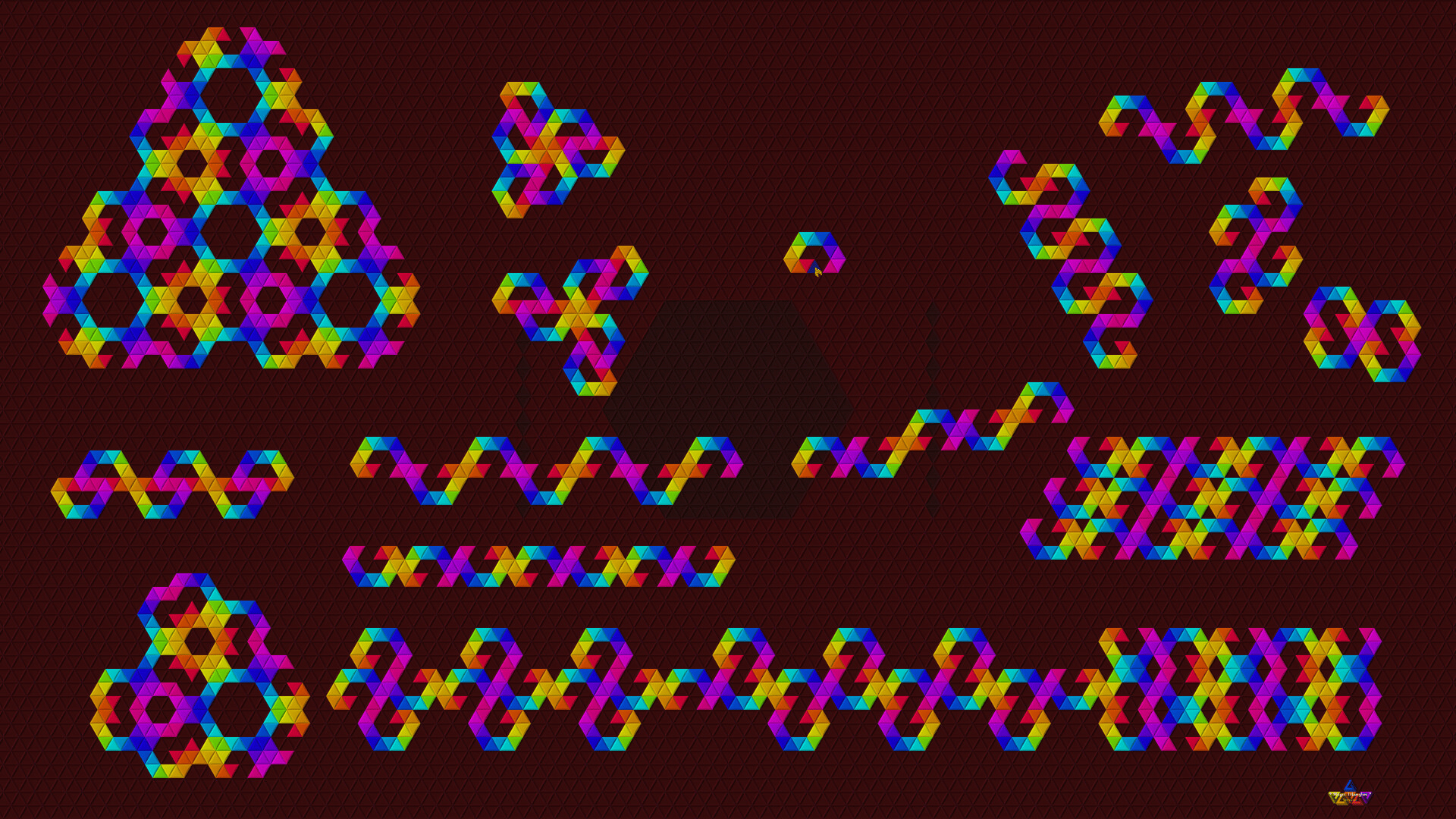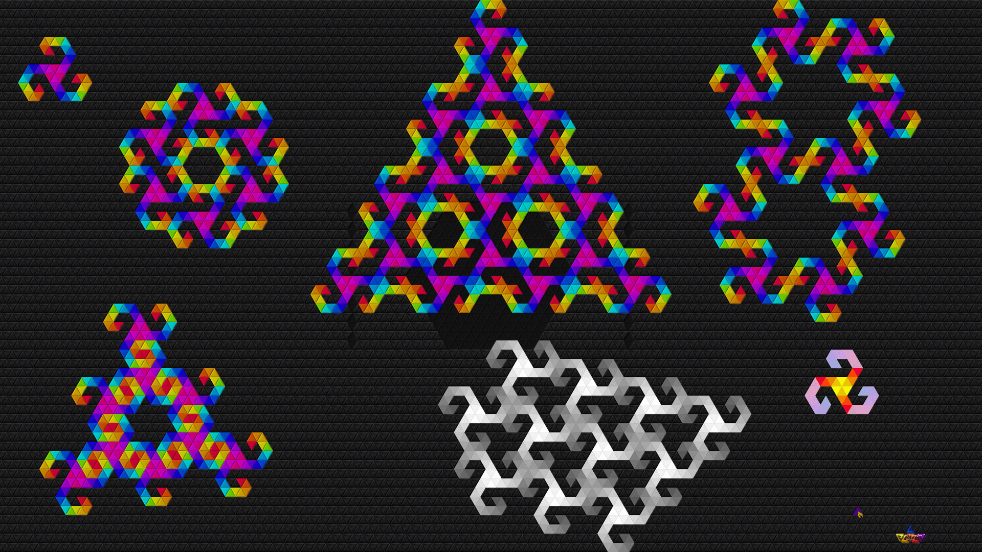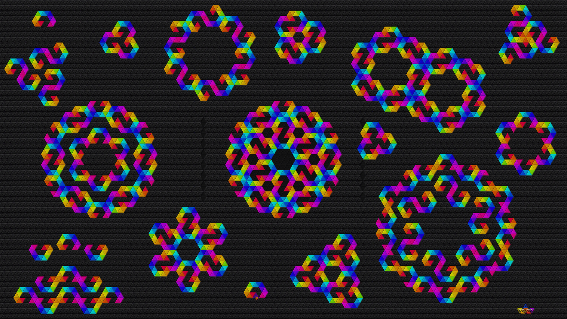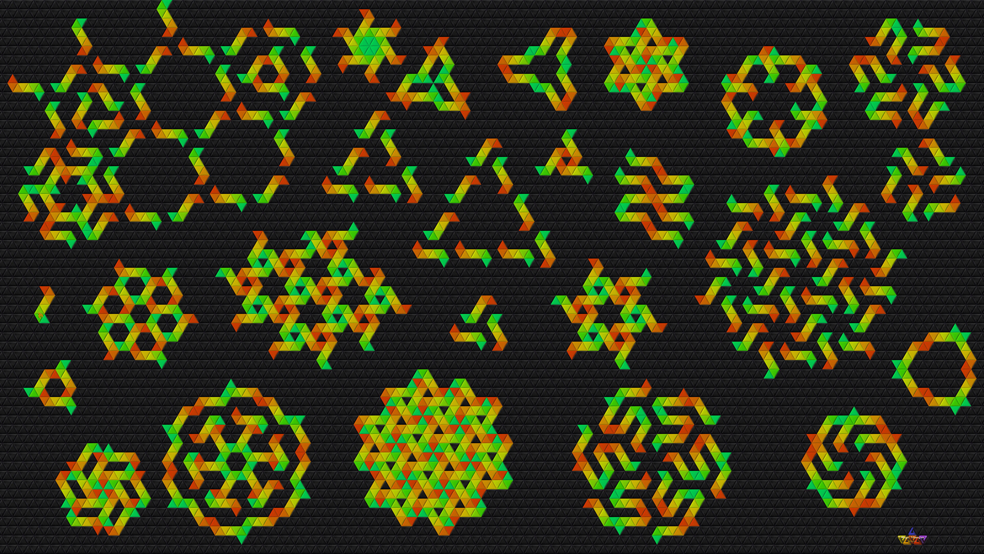 Hexiamond puzzle game and mosaic painting with equilateral triangles.