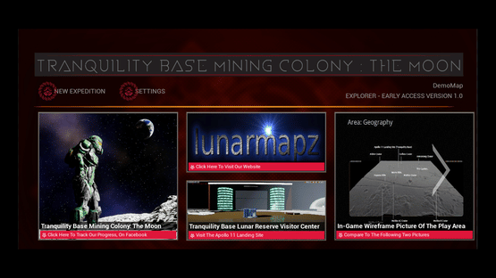 Wanna' walk on the Moon?Tranquility Base Mining Colony: The Moon - Explorer Version, is an open-world game area that encompasses about 17,000 sq kilometers of lunar terrain, around the Apollo 11 landing site. We've taken topographic data from NASA's Lunar Reconnaissance Laser Altimeter (LOLA) which is mounted on the Lunar Reconnaissance Orbiter (LRO) to create this 3d map for you to explore.