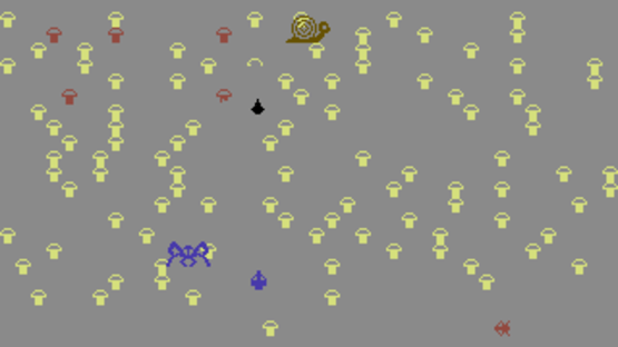 Maggotmania is a single screen shooter inspired by the arcade game Centipede where you control a blue creature at the bottom of the screen trying to destroy a large maggot that appears at the top of the screen over various levels. You can move left or right, and forwards a short distance as well as move backwards and you keep firing upwards when you fire your weapon. The maggot moves across the screen and when it hits a flower or the edge of the screen then it moves down one place and moves the opposite way. When you hit the maggot, it splits into two parts and keeps moving downwards towards you leaving behind a flower. Flowers stop your bullets but after a few shots it disappears and if you hit a flower then you lose one of three lives. Other creatures make an appearance like a spider and snail and these can be shot for bonus points. If the maggot reaches the bottom of the screen then it starts to move upwards and when destroyed you move on to the next level.