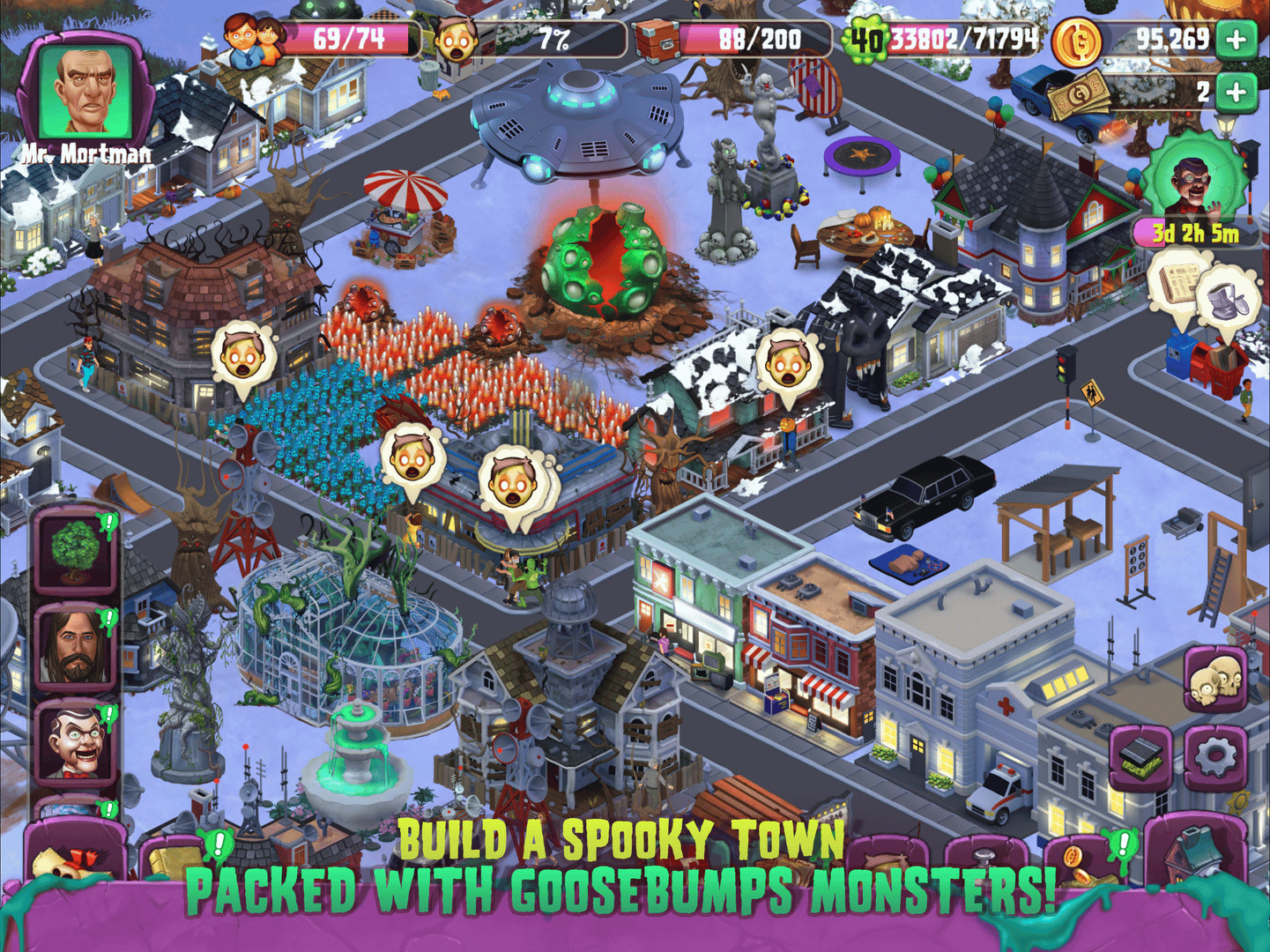 R.L. Stine's "Goosebumps" monsters have come to haunt your phone! In Goosebumps HorrorTown, you can build a town and fill it with the scariest of monsters from the hit horror series. Gather a scary assortment of sinister creatures and terrify townsfolk, or play as humans to defend against the monsters! Collect resources, scare humans, investigate monster activity and explore the map to unlock new areas and adventures. As monsters, you can scare humans to obtain materials and add new Goosebumps monsters. As humans, you can spy on monsters to find out what's going on in their town (if you dare). The game features original content that will terrify and delight Goosebumps fans, with animations and missions for humans and monsters alike. The more experience you gain, the more you unlock new content, grow your town and discover chillingly fun new adventures.