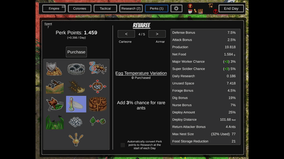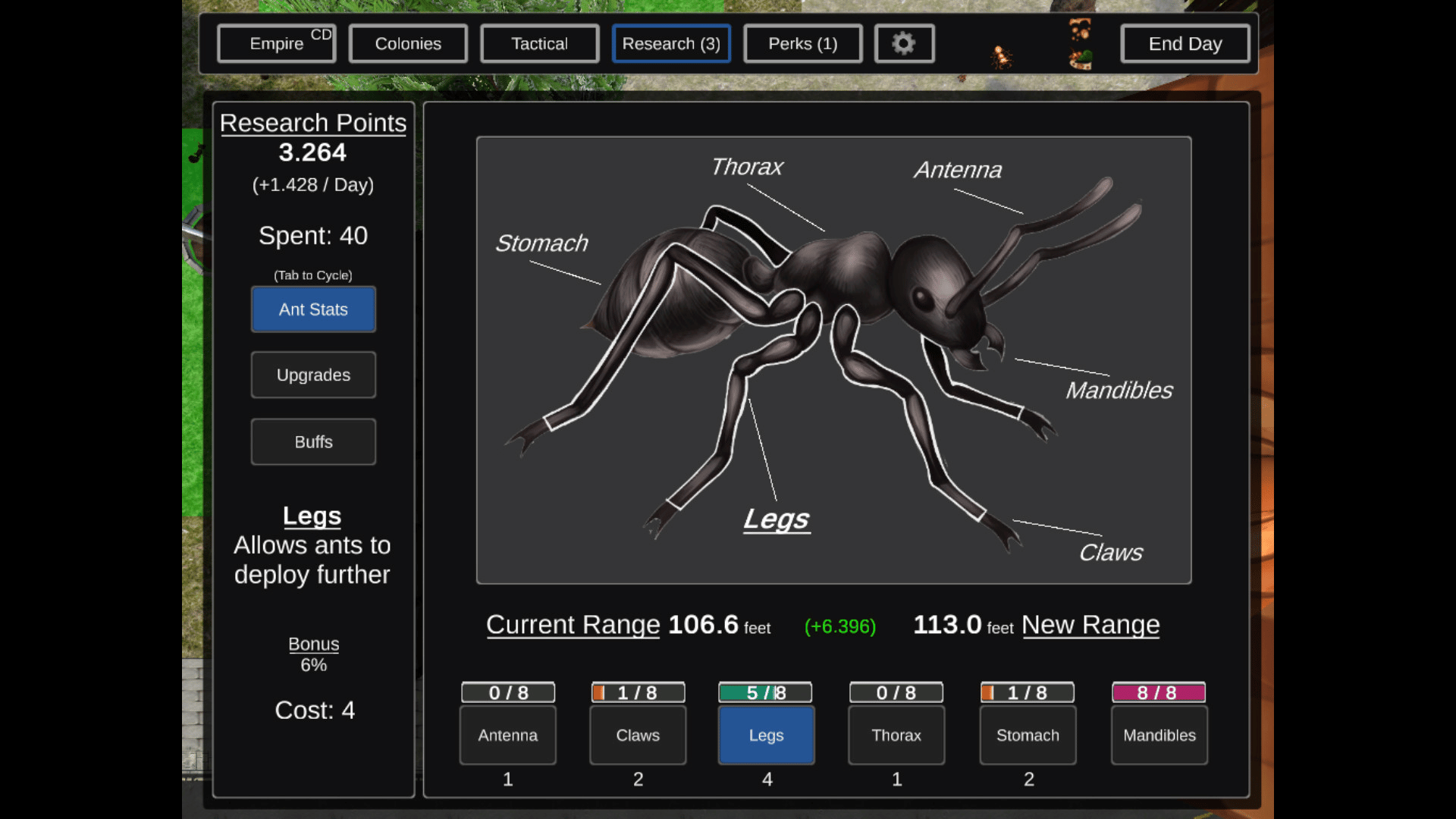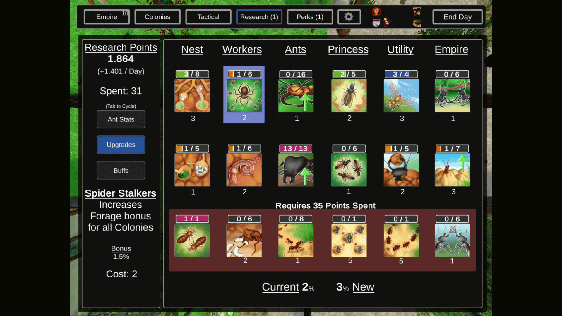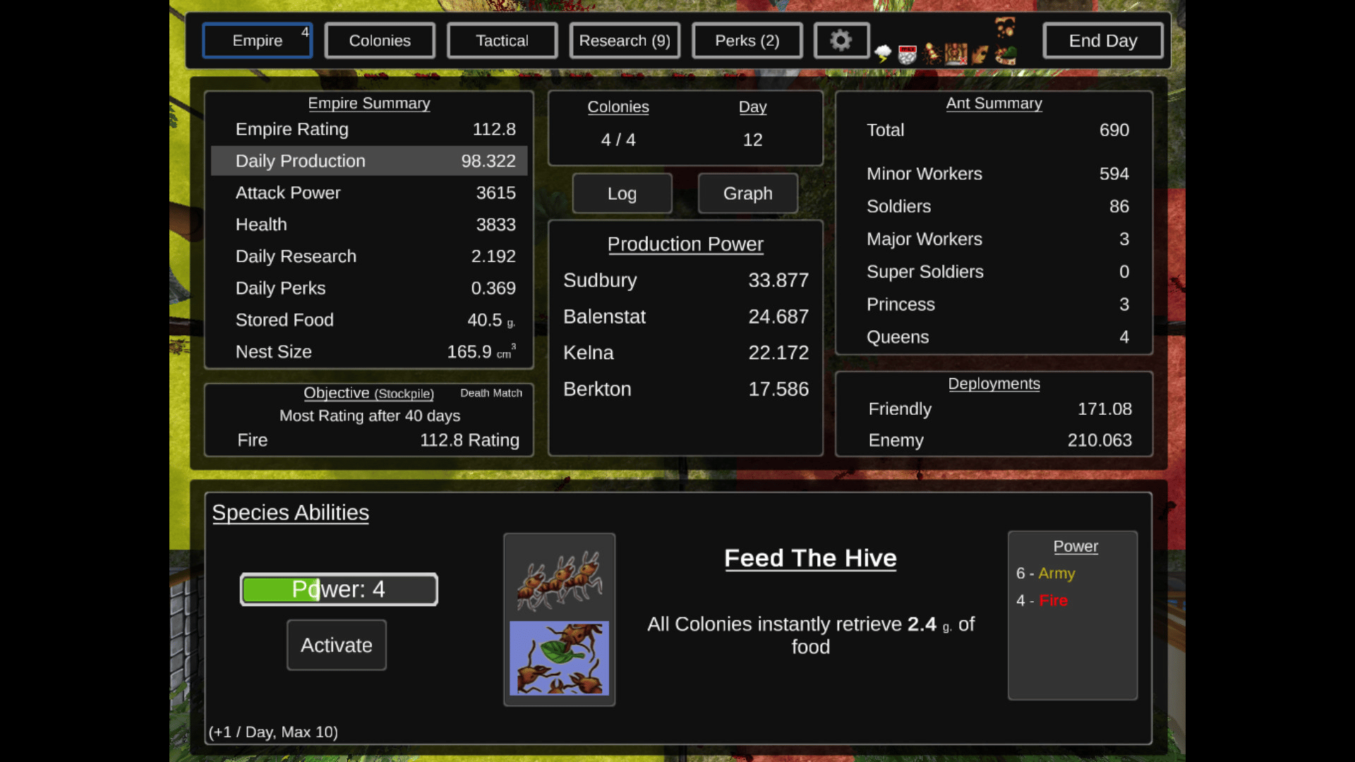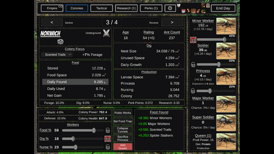 Ant Empire is a tactical strategy and management game set in a world where ant species battle to become the top empire. This deeply detailed and nostalgic turn-based simulation is a mix of many popular older games-- but with a much more modern feel. Select from 5 unique species that feature characteristics in the game based on how the species actually behaves naturally.
