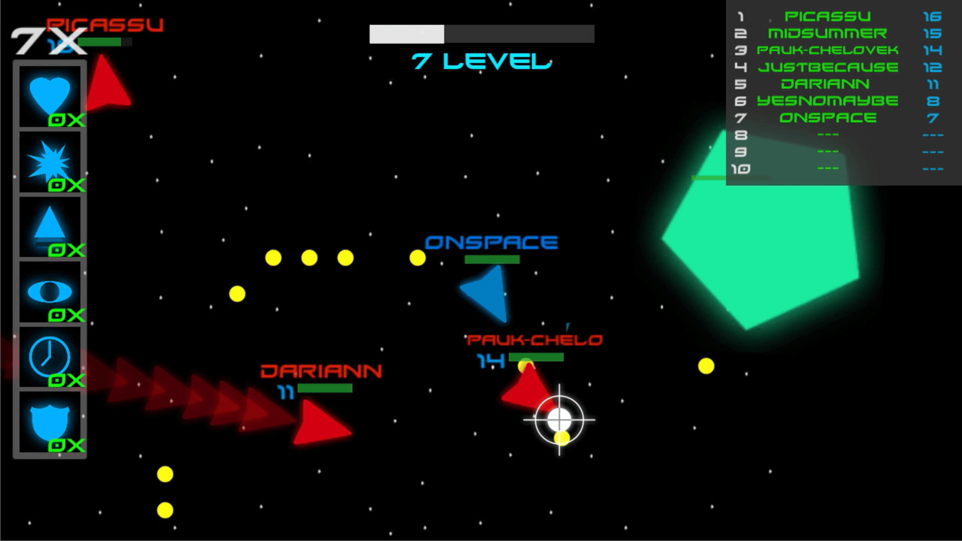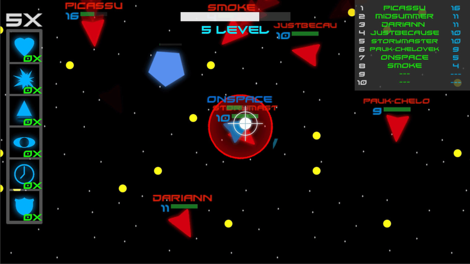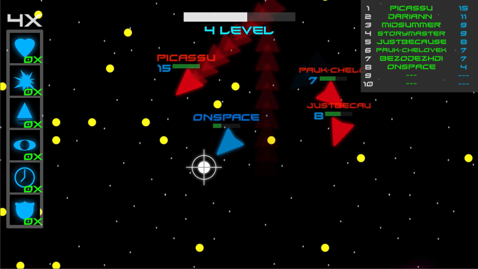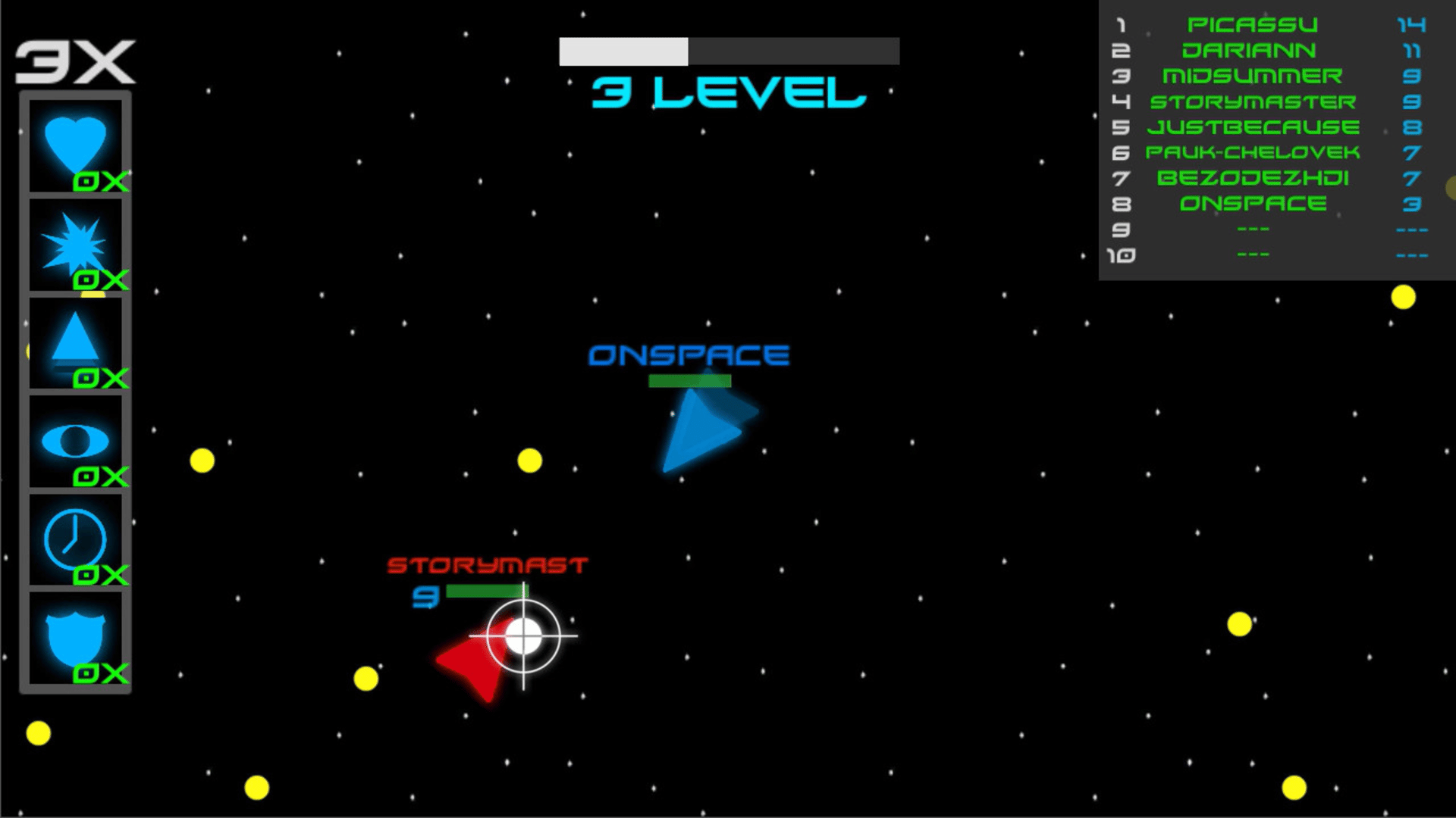 OnSpace - this is roguelike game in space setting. collect small stars and destroy another space ship.
