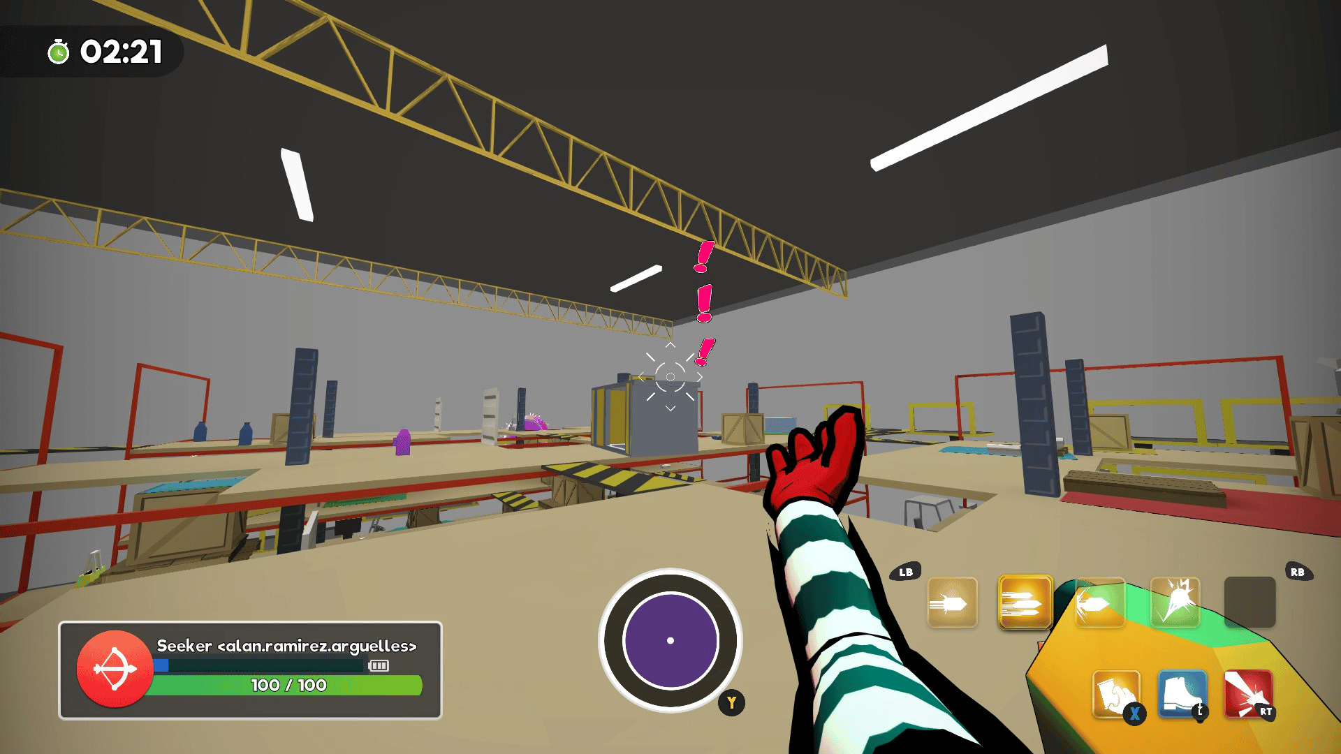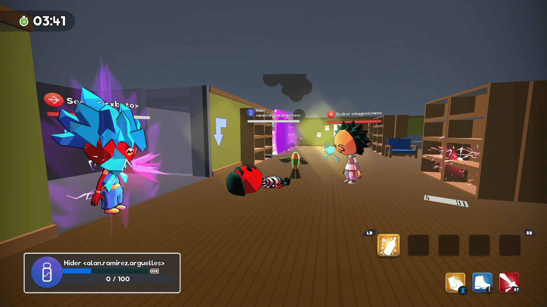 Super Seeker! is a “hide & seek” multiplayer game, where one team can disguise themself as Props of the environment, meanwhile the other team has to unmask them and shoot them down before the time hits 0.