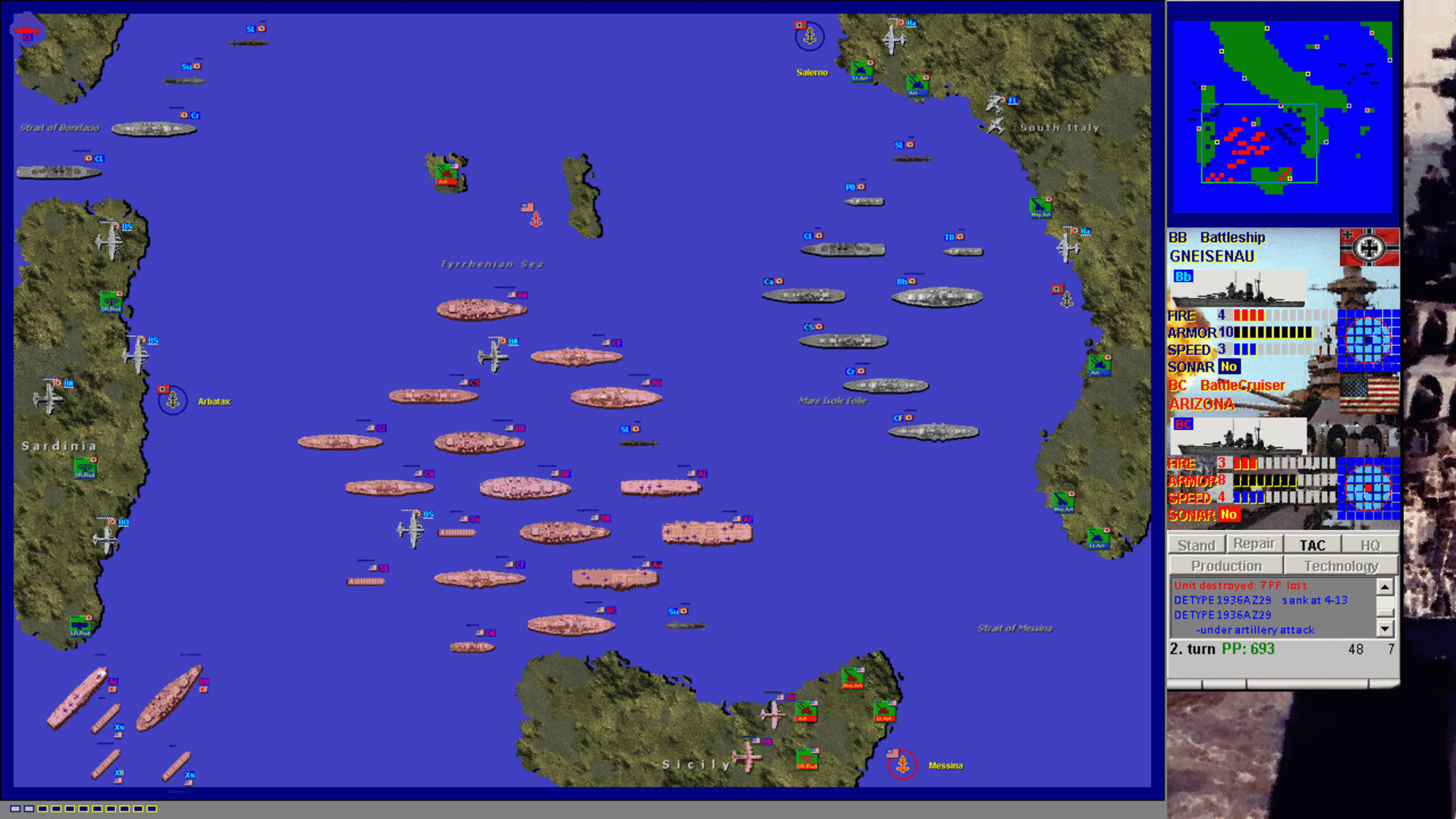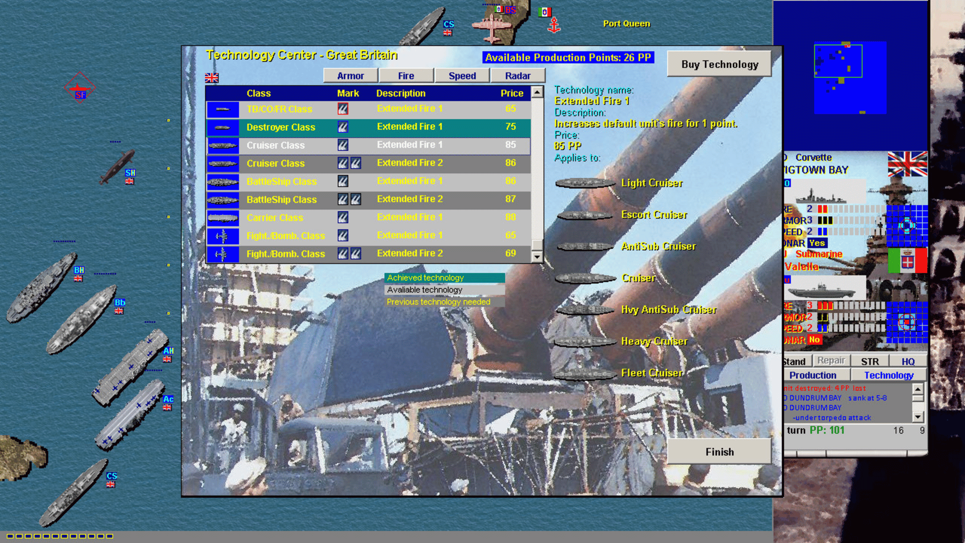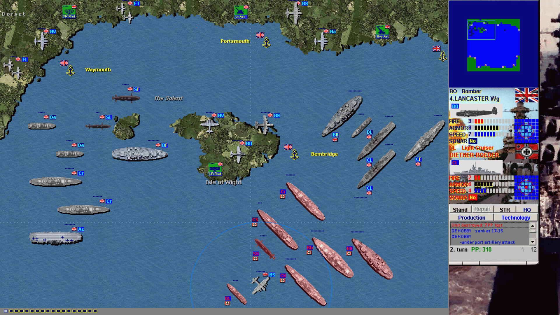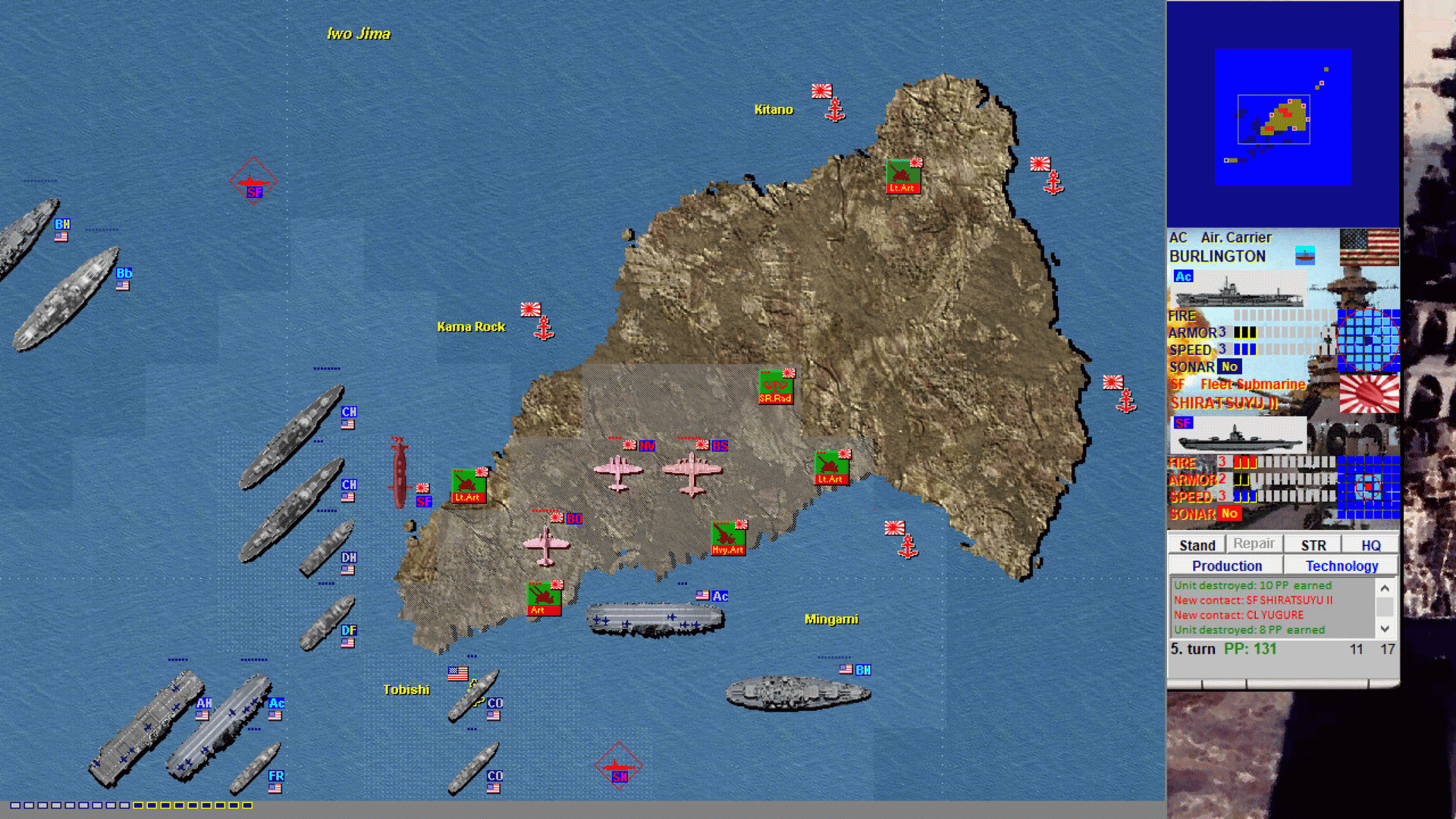 Move, search, destroy and build ships/subs/aircraft: casual turn-based naval strategy battleship game. More than 80 missions, Death-Match and Free Hunt scenarios and campaigns from Pearl Harbor and Lamansh to the Iwo Jima and Okinawa battle, with over 50 ship and aircraft types.