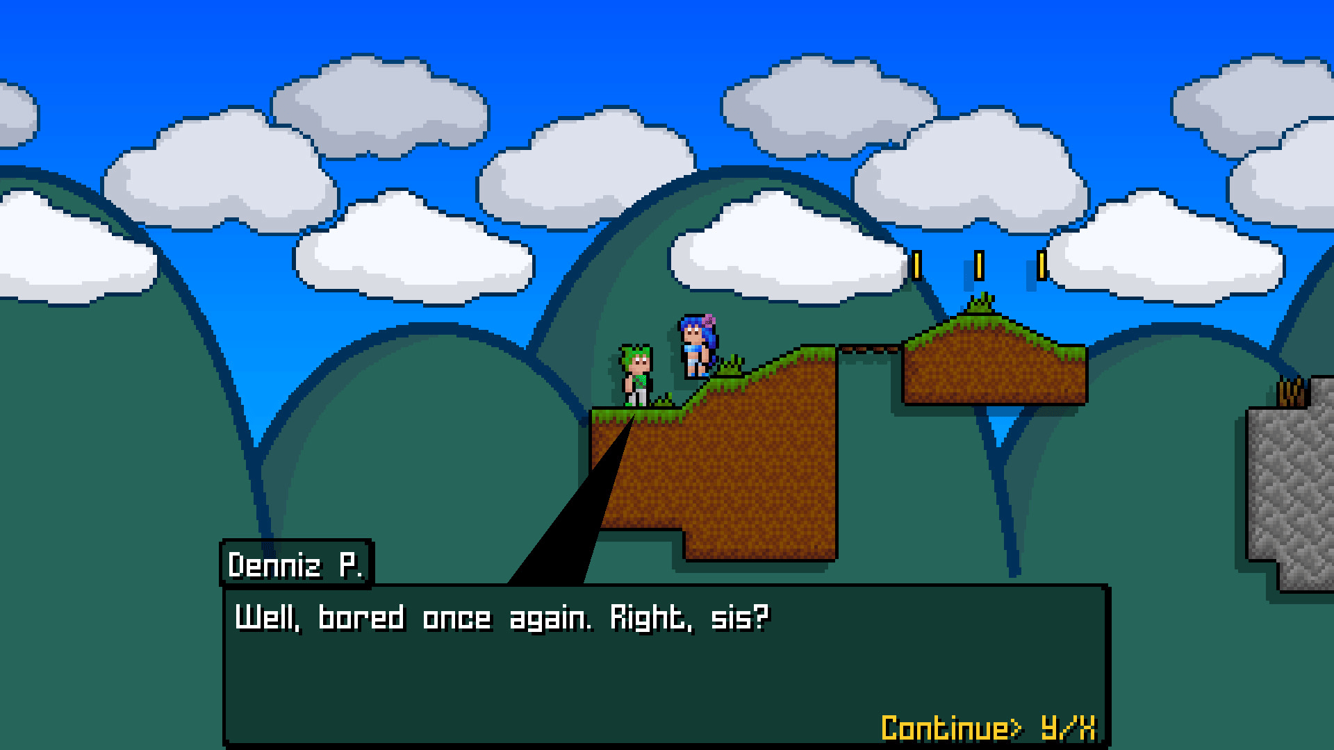 The Siblings Denniz and Diana have to traverse a multitude of areas by jumping, sliding, climbing and fighting through them in this 2D-Jump'n'Run. Meanwhile, they encounter a... Mechanic-Pirate? Well, they have to stop him, whatever his plan actually is.