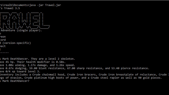 Trawel is an open world text adventure. What does that mean? It means that it's a text adventure with a world filled with locations for you to explore, partly handmade, partly procedurally generated.