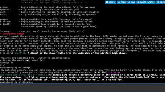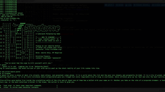 Sindome is a cyberpunk MOO (a text-based online virtual reality system to which multiple users are connected at the same time). Roleplaying in Sindome is unique in that most of its coding is custom, employing XML, File-IO, custom web based websocket powered game client (optional), and a graphical web interface. Sindome has been online since 1997. The Sindome world is based on the cyberpunk genre of science fiction. Sindome draws its inspiration from books, movies, and traditional role-playing games like: William Gibson's Neuromancer, Count Zero, Virtual Light, Idoru, "Burning Chrome"; Neal Stephenson's Snow Crash; Bruce Sterling's Mirrorshades, Richard K Morgan's Altered Carbon and Islands in the Net; R. Talsorian Games' Cyberpunk 2020; the movies Blade Runner, Judge Dredd, and The Matrix series.