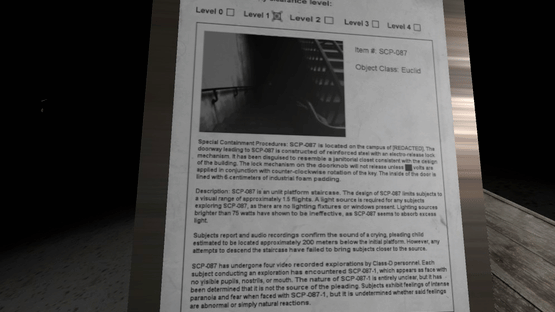 Virtual Reality survival rogue-like game based on the SCP-087 lore. You are scientist from SCP foundation inside SCP-087. How long you can survive? Can you find the way out?