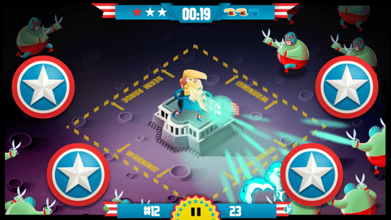 A fast reaction survival defense game in which you play as the 44th President of the United States defending the White House (on the moon) against the nightmarish hordes from beyond the wall. Fast moving hordes upon hordes of various enemies storm towards you from multiple directions. You shoot them down by pressing fire buttons according to direction of attack. As you clear waves and defeat boss enemies, you gain power levels and can buy upgrades.
