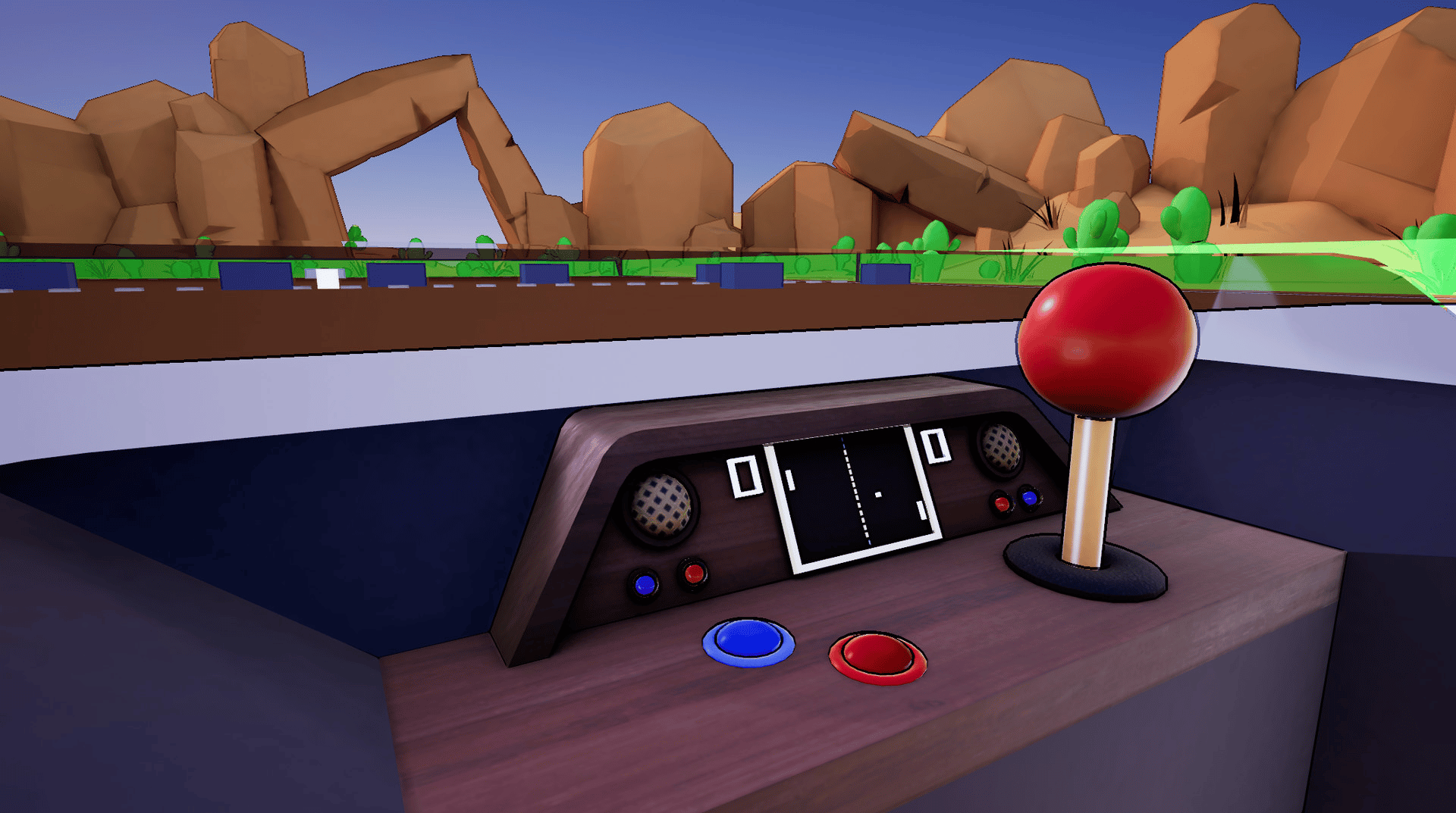 Xong - A ball skyrockets back and forth between you and another player. You are in a command center controlling a paddle. You can bounce the play ball towards your opponent by simply positioning yourself in front of it and waiting for it to bounce off you. The goal is to get the xong ball into the competitions goal.
