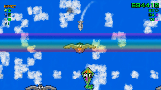 You play as a bomb that traverse three stages of Earth's atmosphere freely moving within the flight corridor towards the target cityscape, bashing various enemies with your super tough nose, gaining powerups, and "collecting" clouds to charge your retro thrusters.