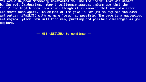 Bajoran Mercenary Adventure! is a single player, interactive fiction game that was developed with the Adventure Game Toolkit. You are a Bajoran mercenary contracted to find the 'orbs' that was stolen by the evil Cardassians. Your sources tell you that the orbs are kept in a cave, though it is rumored that some who enter are never seen again. Your mission is to retrieve as many orbs as possible and return (SAFELY!)