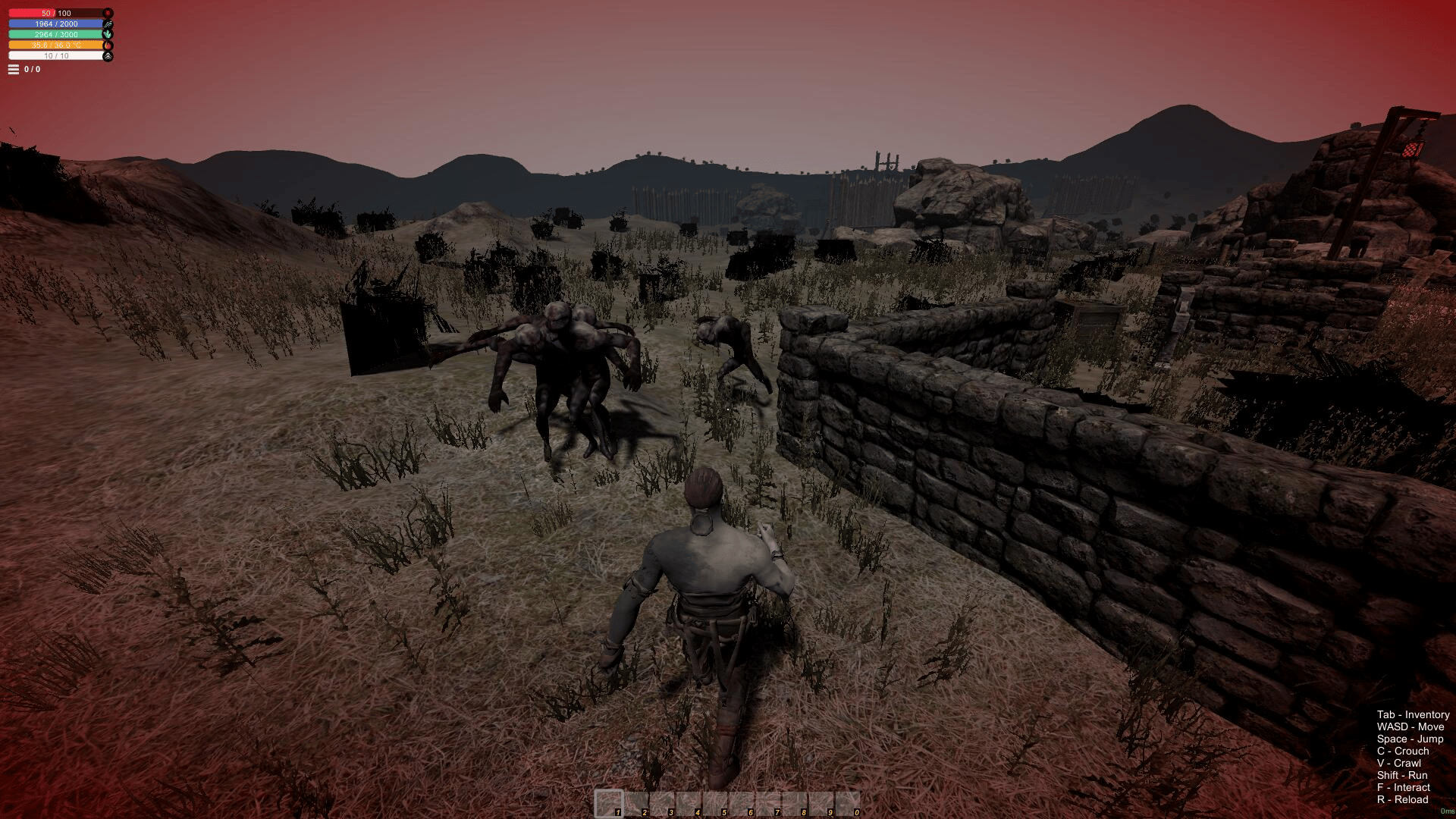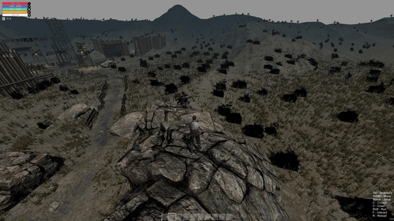 The player is in a desolate area surrounded by zombies. Switching between first and third person, the player can explore their surroundings, find supplies and weapons, kill the zombies and try your best to survive.