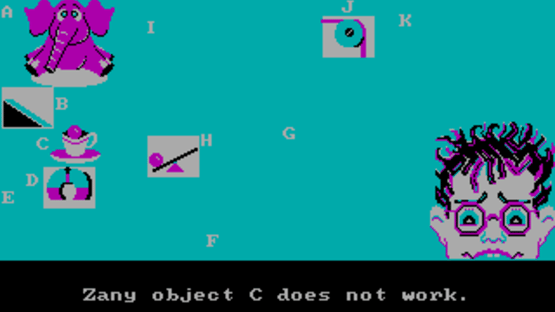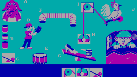 Similar in concept to the later (and better known) Incredible Machine series, Creative Contraptions is all about creating silly machines from wacky parts to accomplish even wackier tasks. The puzzles consist of Rube Goldberg contraptions with wrong or missing parts, and the player must figure out the correct replacements - from basic devices such as pulleys and ramps to absurd objects like elephants, cannons and boxing gloves. Three game modes are available: in the first, you pick a goal for your contraption, and your job is to fill in the basic mechanisms; the second puts you in charge of the "Zany Objects". The real challenge lies in third mode (Contraption Mix-Up), which takes you through a sequence of puzzles, complete with a time limit and a scoring system - the fewer mistakes you make, the more points you earn. Each sub-game can be played in two difficulty levels, and there's also a tutorial which explains (and demonstrates) how the basic mechanisms work.