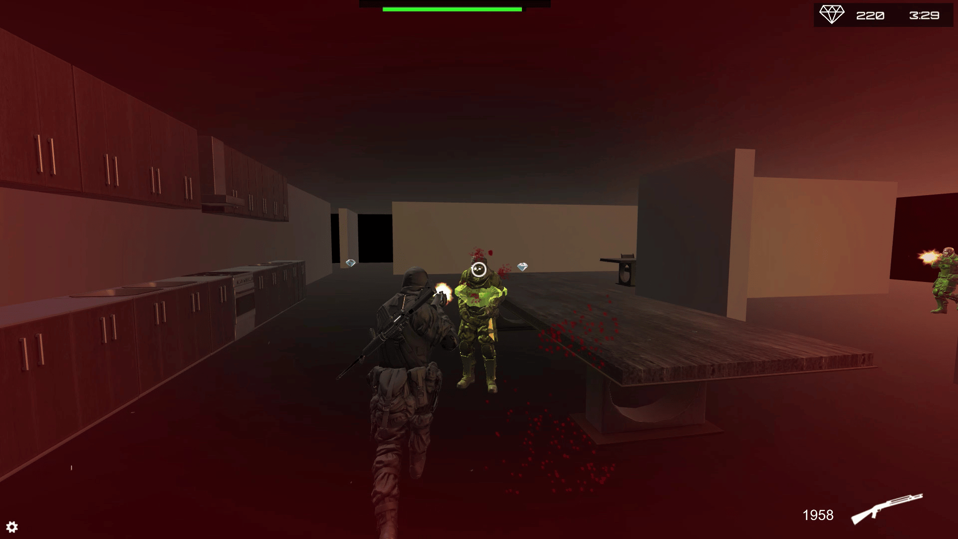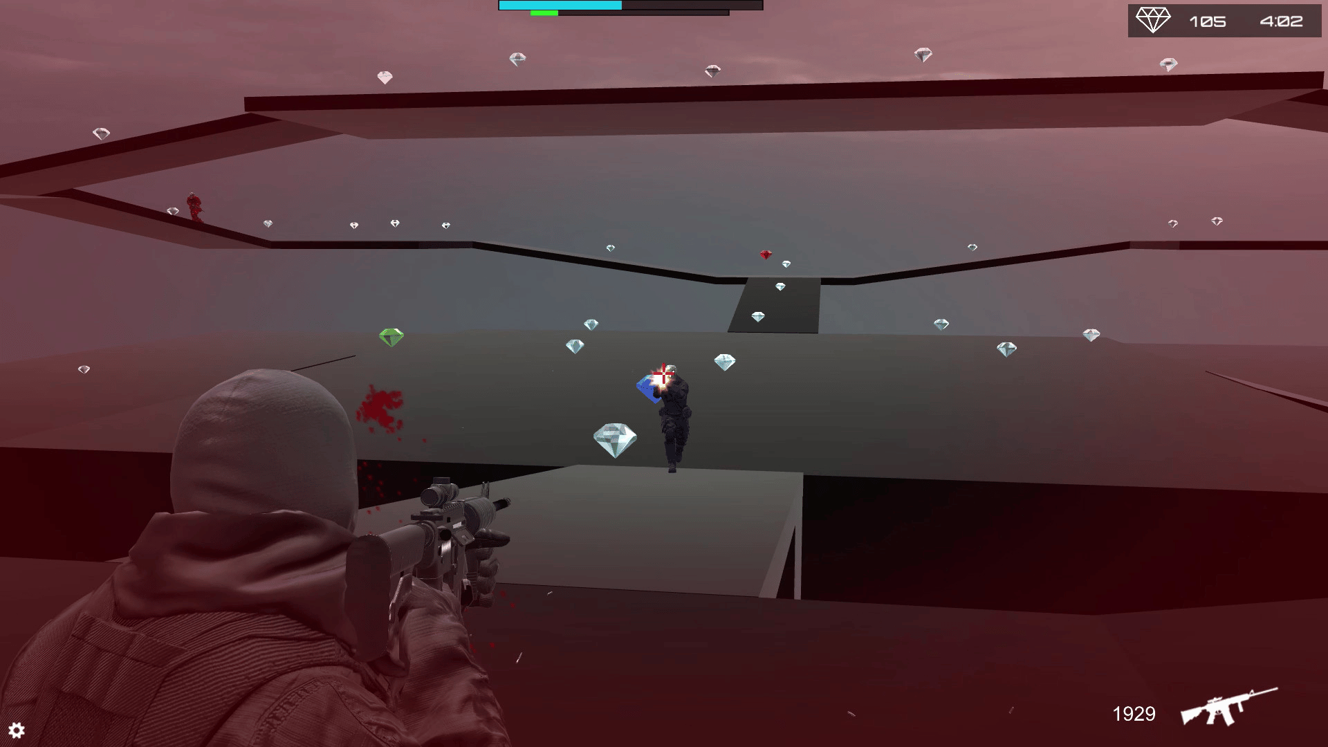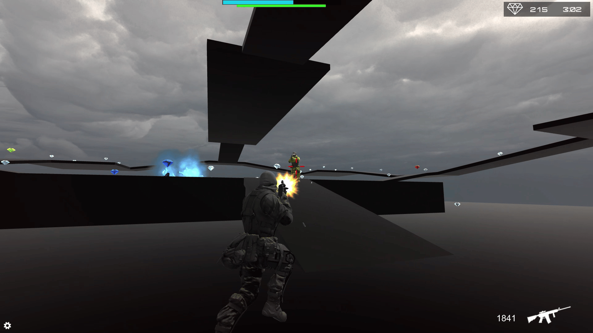 3rd Person Shooter. Assault Rifle, Shotgun and Grenades. Collect Diamonds scattered around the map, with unlimited ammo engage in intriguing battles, beat the enemy and collect their diamonds. Use the Diamonds to continue your journey unlocking maps and setting high scores.