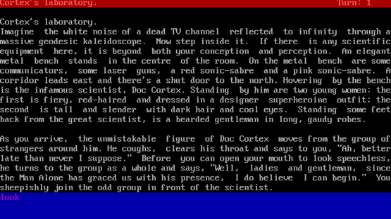 Demoniak is an interactive fiction adventure in which the player guides four superheroes in an attempt to stop the evil Demoniak entering our dimension and doing dastardly things by sealing his gateway. The player may 'become' another character at any time and give that character instructions, objects, such as weapons, may be passed from one character to another.