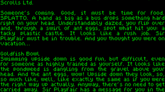 Inter-Dimensional Espionage. Inter-Dimensional... because you can "warp" into the body of a living thing in this or any other dimension. Espionage... because there are good guys and bad. And you're a good one... with years under your belt and a multitude of successful missions behind your dark glasses. The payoff? You get a vacation, and the ultimate vacation in this business is to become a goldfish. Yes, a goldfish. Hey, it's cushy. You swim a little, eat a little, live in a castle. (So what if it's plastic.) Just as you were getting into the vacation mode (umbrella drink and all), the tide turns. The most dangerous group of inter-dimensional anarchists surface - the Seven Deadly Fins. This septic septet will stop at nothing to destroy all forms of life as we know it. And wouldn't you know it, you are drafted to stop them!