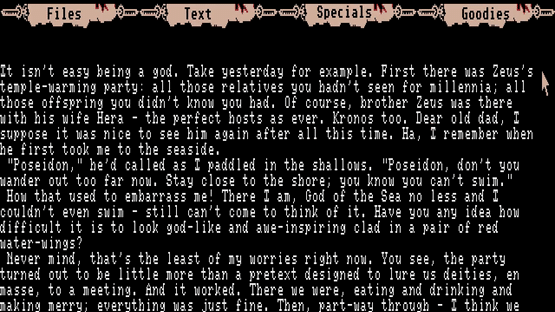 Myth is set in Ancient Greece, place of myth and legend. Hence the title. You are are Poseidon, the Sea God. You have to journey to the Underworld to get the Dark Helment of Hades.