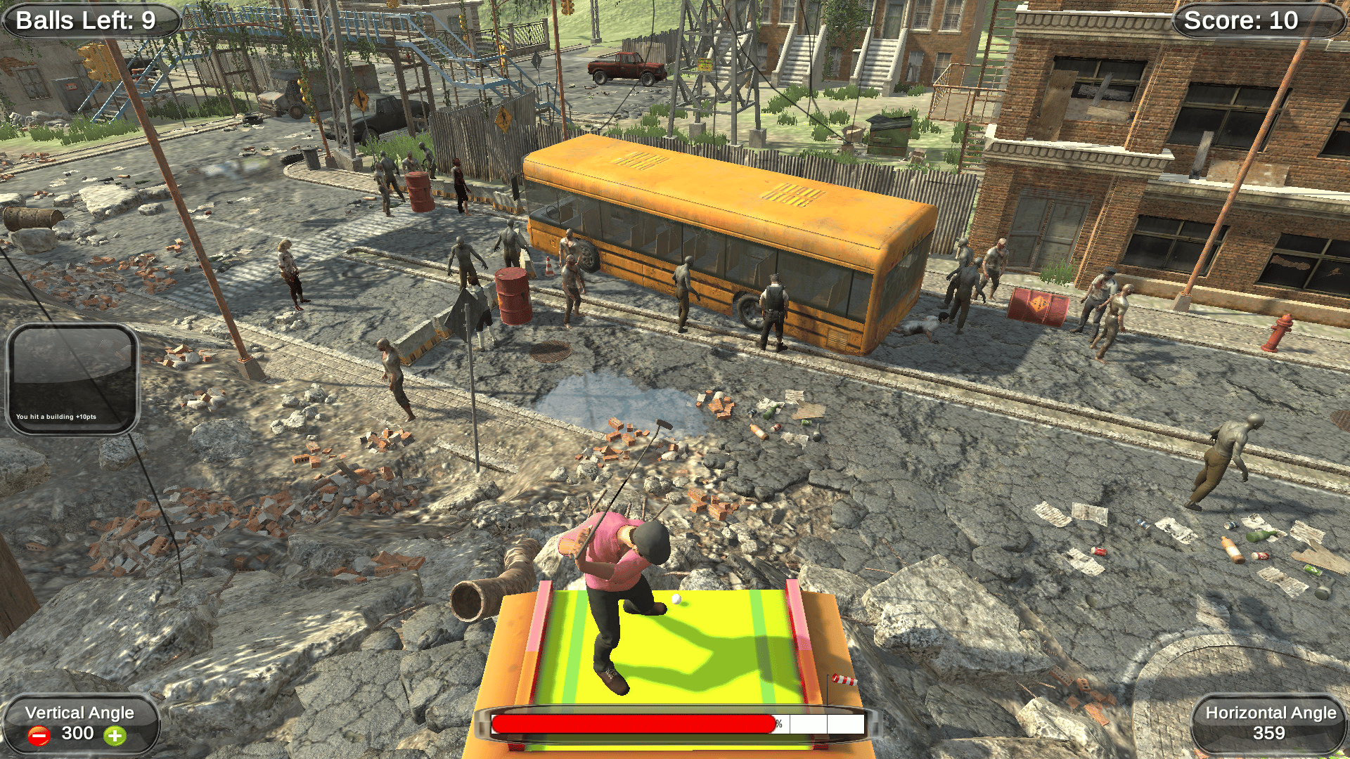 Zombie Golf is fun mini-golf style game set in a zombie filled post apocalyptic city. Get points by taking out zombies or hitting numerous items throughout the city. Test your skills and compare scores.