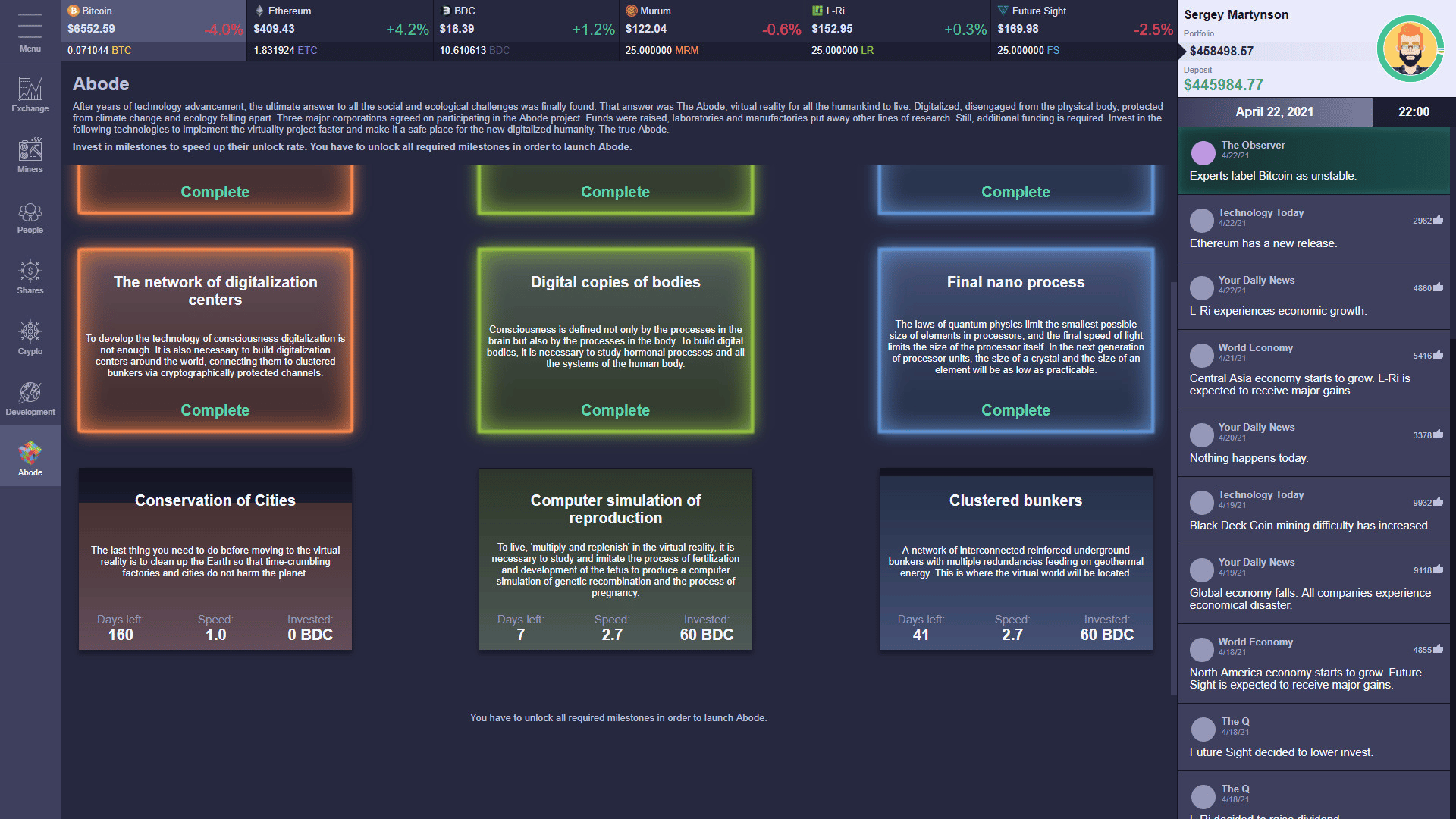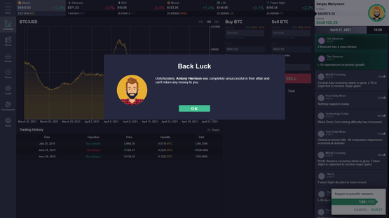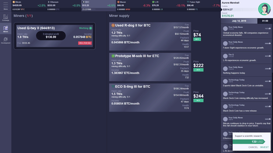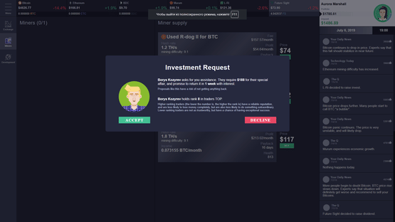 Cryptofall is an investment simulator. Start as a trader during a cryptocurrency boom and explore all the possible ways to invest your wealth. Trade and even mine trending cryptocurrencies, growing your mining pool.