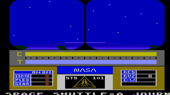 Space Shuttle is a simulation game where you are the pilot of space shuttle Discovery. Your goal is to launch the Discovery, establish an orbit around the Earth, open the cargo bay doors and recover a satellite to perform repairs, and finally land the Discovery successfully, all while using as little fuel as possible. Each time the complete mission is accomplished, it will then repeat at a higher difficulty level (in the higher difficulty levels the satellite has a more erratic flight path). The game is played from a first person perspective in the space shuttle cockpit where you can control everything from the shuttles engines to cargo bay doors. When the game is over you will be given a ranking which is based on the number of successful dockings and the amount of fuel that was used.