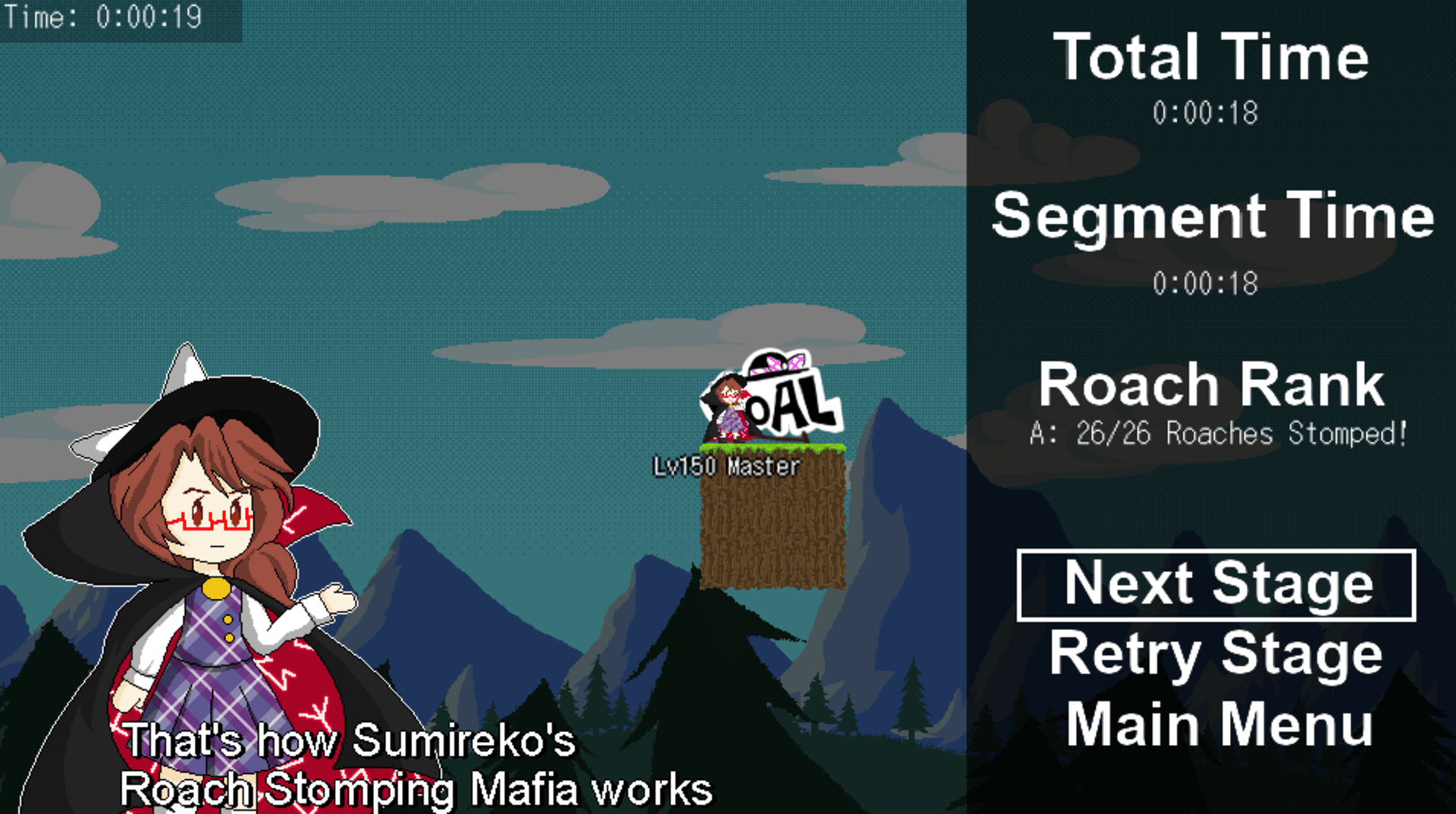 A platformer game jam project featuring Sumireko Usami from Touhou Project, where she must stomp on cockroaches consecutively using air dashes.