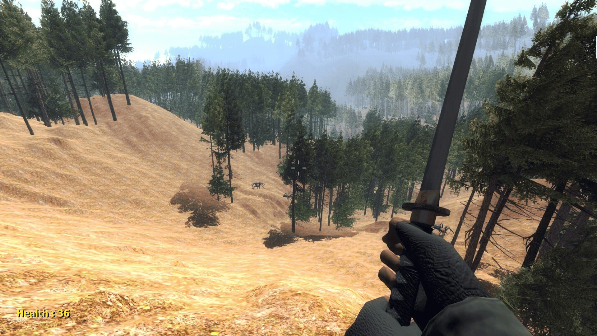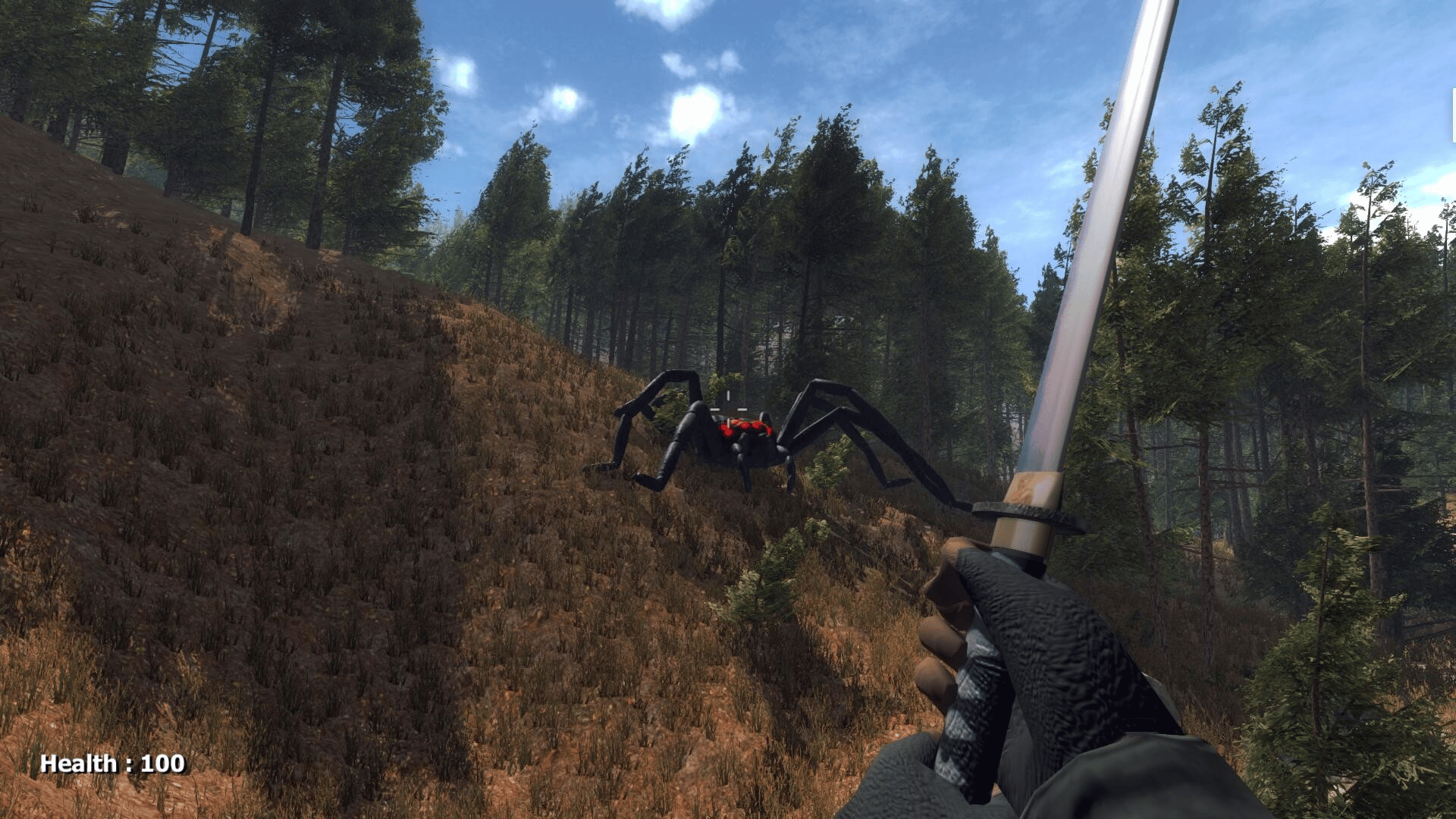 This is a first person action adventure game,The player is located in a forest full of spiders,Players are free to explore the surrounding area,Players have both long knives and bows and arrows, and must avoid or kill monsters,Players need to survive as long as possible.