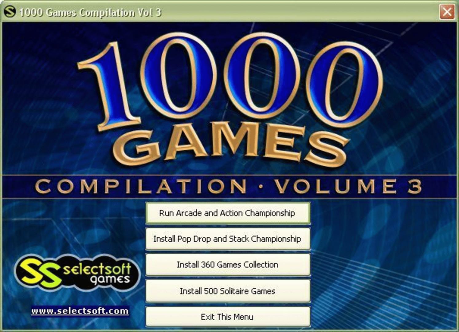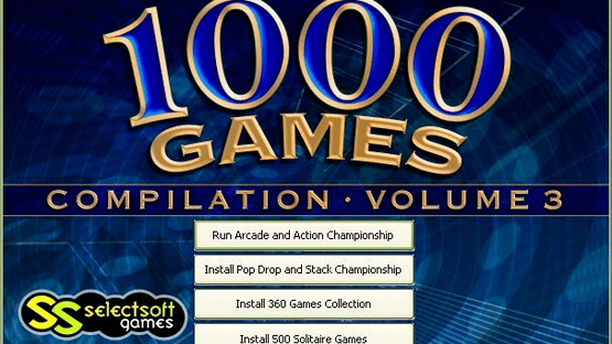 1000 Games: Volume 3 is, as the name states, a compilation of one thousand games which the publisher attests is a collection of one thousand games which includes neither shareware games nor demo games. The games in this compilation come as four separate groups, each installs separately:* Arcade and Action Championship: This is a version of Selectsoft's Arcade and Action XP Championship Pod Drop and Stack Championship: This is a version of Selectsoft's Pop! Drop! & Stack! XP Championship 360 Games Collection: This is composed of versions of three separate Selectsoft products. There are one hundred and sixty games from Sudoku Mania!, one hundred levels from Wacky Bird Hunter, and one hundred levels from 3003 Crystal Mazes. 500 Solitaire Games: this is a version of Selectsoft's Solitaire XP Championship complete with game creator and editor. This version has far fewer different backgrounds and card backs and just two styles of card face.