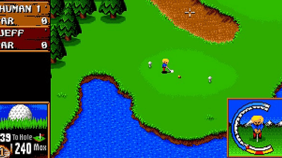 Sensible Golf is a 2D golf simulation. Having been quite successful with their cute action soccer game Sensible Soccer, Sensible Software decided that the concept of "No fuss, just fun" could be applied to other sports, too. They chose golf. Sensible Golf is not an accurate simulation of golf, but an action adaptation of the sport streamlined for quick and easy gameplay. Consequently, complications such as wind and terrain heights are not featured, although the green has little arrows indicating the slopes. Apart from that, the player's only concerns are the water and sand hazards, and the distance to the hole. As a result, Sensible Golf is instead a practice in target shooting, rather than a golf game. Striking involves only two action: Aiming the pointer in the desired direction, and pressing the action button three times. The game uses the well-known three-click-control, with which you set power and swerve of the strike. The computer automatically suggests a proper club, but the player may change it manually. A pop-up map helps one find their bearing. The courses are fictional, composed from a pool of holes which often appear in multiple courses, sometimes with minor variations. Play modes include single 18-hole rounds, a complete season and a tournament. Up to 72 human players may participate in the latter.