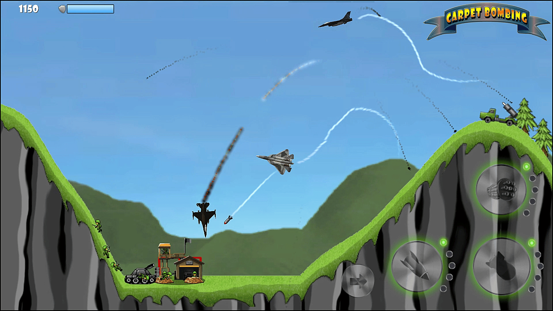Carpet Bombing is a retro-style, 2D aircraft arcade game. Fly a jet fighter and engage enemy at land, sea and air! Choose from different aircrafts - each with their own unique flying profile. Arm yourself to the teeth and get ready for some serious action!