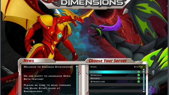 Bakugan Dimensions was a beta MMORPG created by Spin Master that ran between June 1, 2010–June 30, 2011. It allowed players to create avatars, explore the game's world, and use Bakugan (either provided in-game or purchased in real life) to brawl non-playable characters and other players. It contained characters from Bakugan: Gundalian Invaders, though the game was largely set independent of the game's timeline. At the beginning of the game, after the character creation menu, players were supplied with three default Bakugan in their chosen attribute. They did not gain experience and levels as quickly, but could be used without making any purchases. To acquire additional Bakugan, DNA Codes found on real-life Gundalian Invaders and Mechtanium Surge Bakugan toys could be input into the game to acquire their game versions.