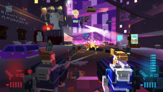 Retro cyberpunk shooter/shooting gallery to play with a friend or on your own. Shoot bad guys and bosses with different weapons, fly on cars, check the story revealed in a comic book style.