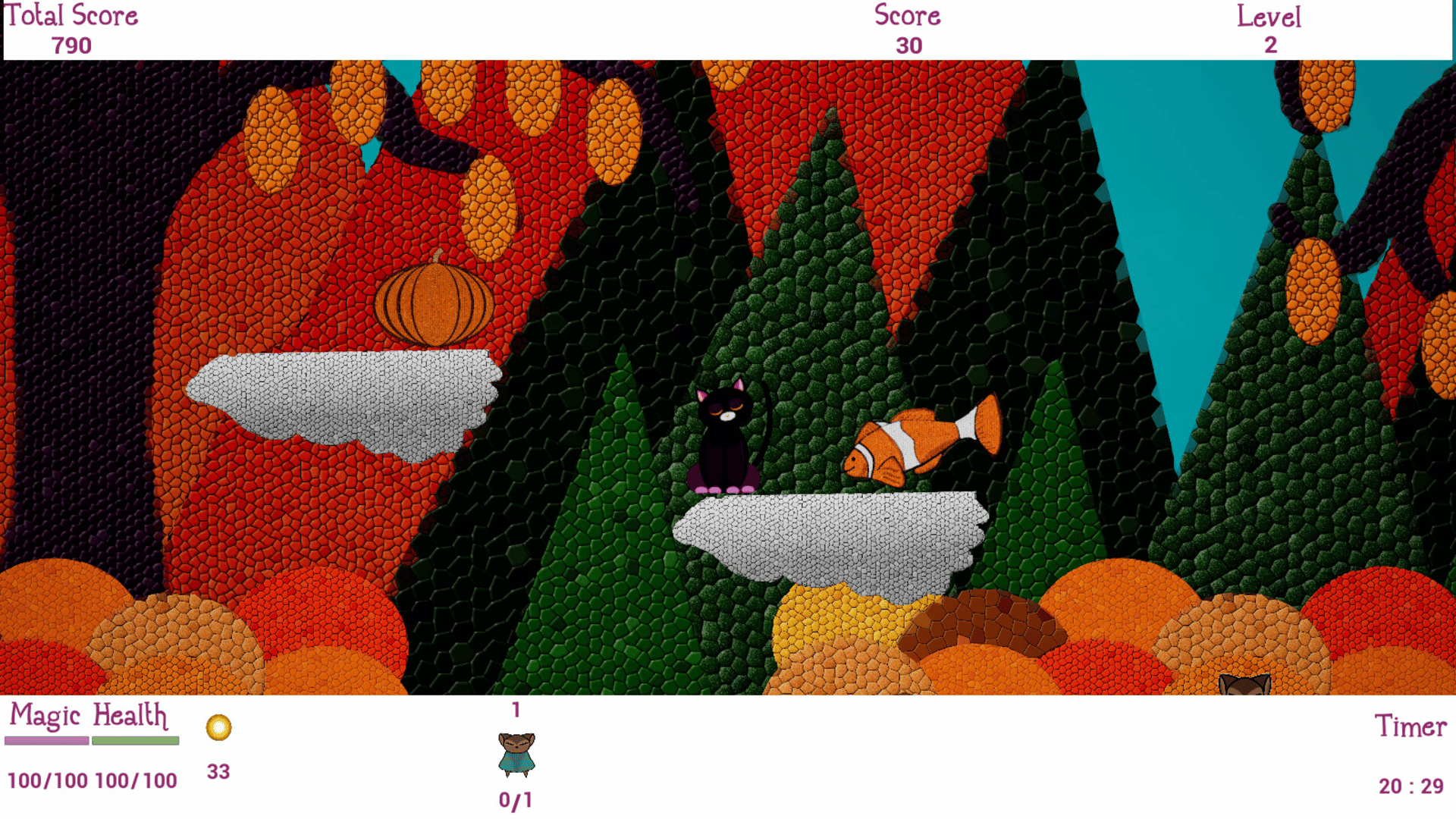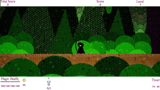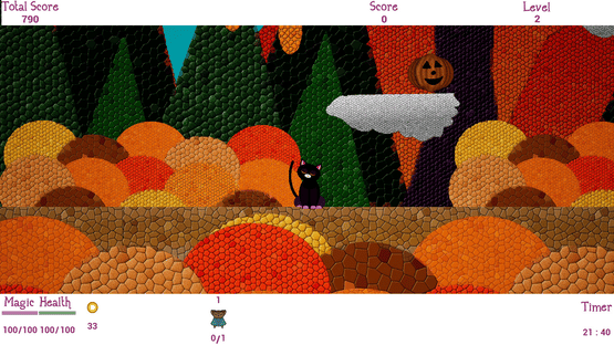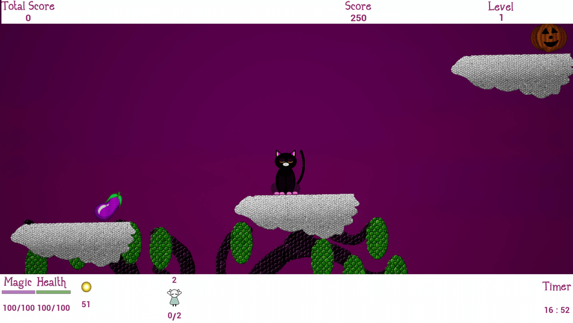Black Cat Adventures is a 2d casual platformer. Explore the levels, capture the creatures with magic, eat vegetables for health, pick up hats and potions to gain magic energy. Portals transfer you between levels. Unlimited randomly generated levels available.