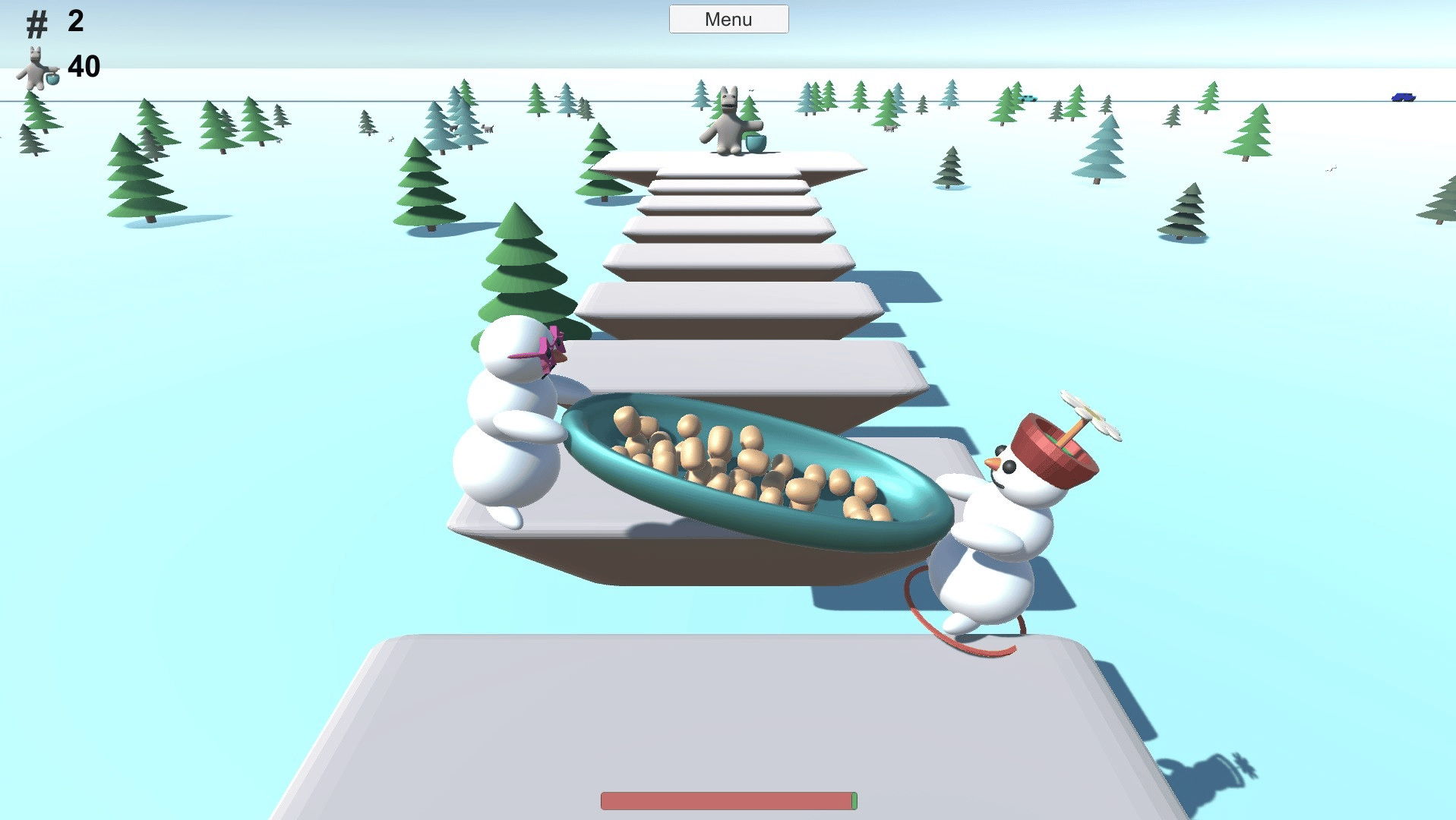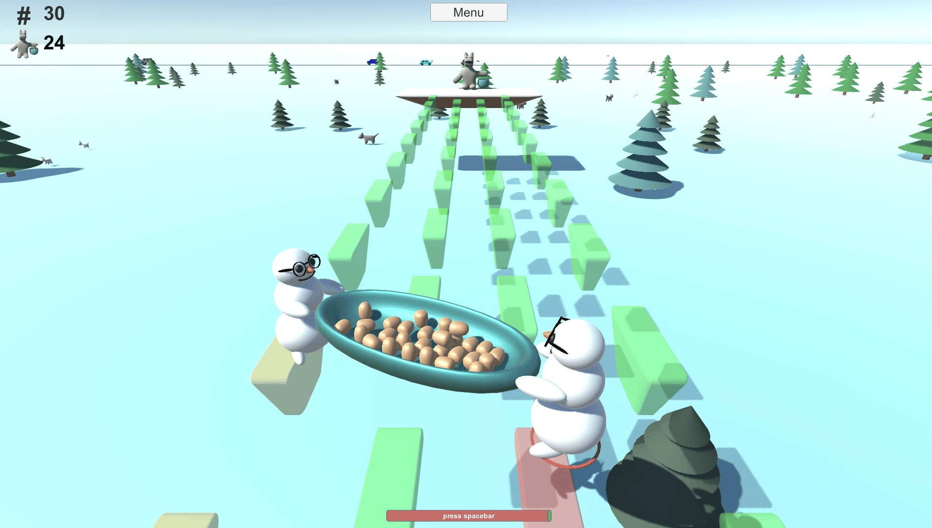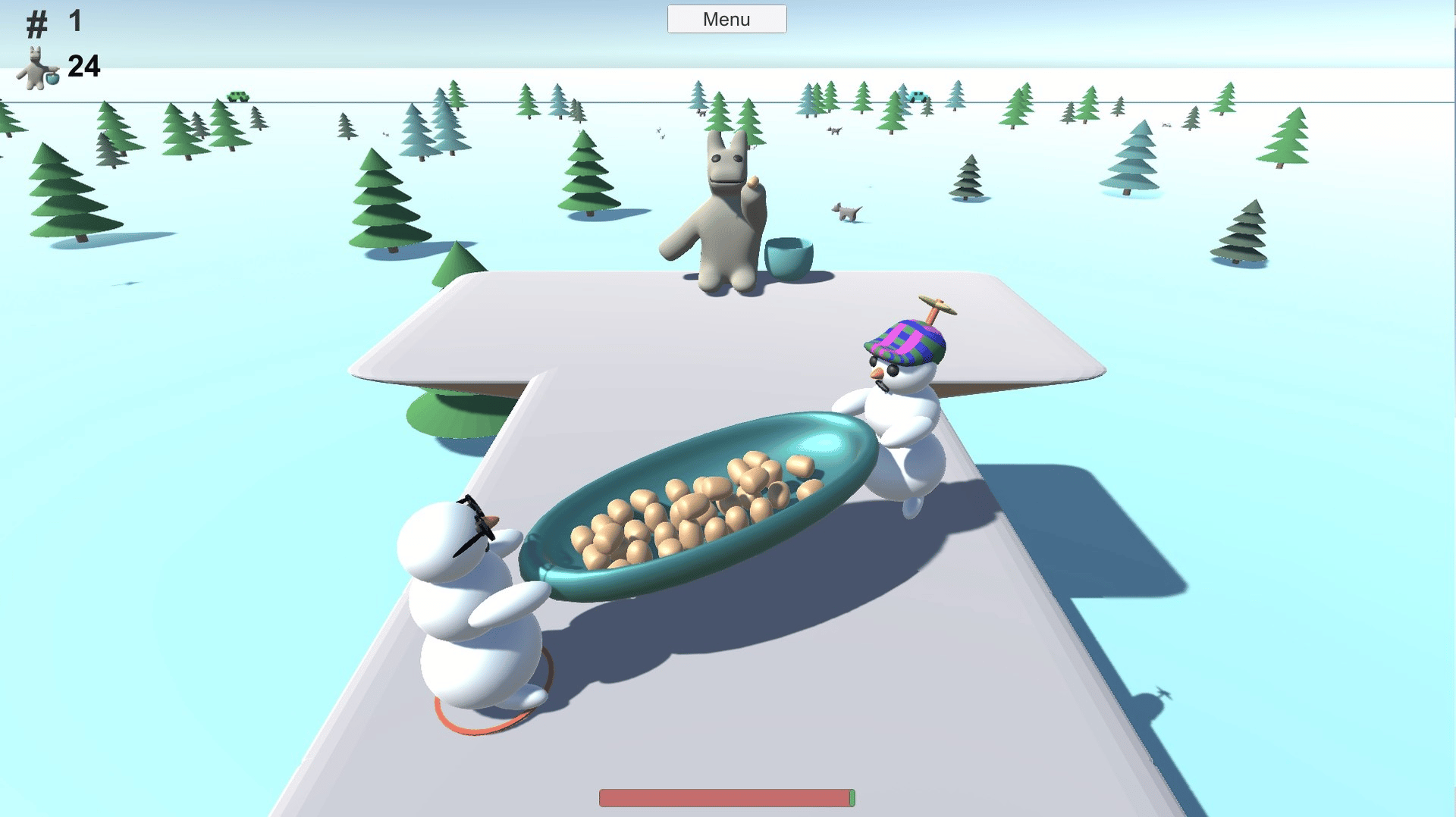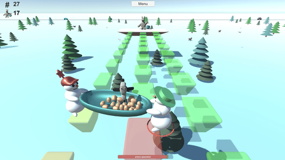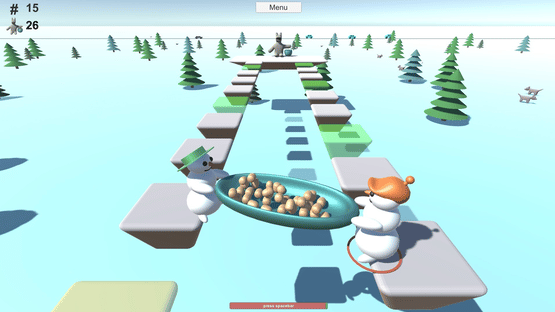 Two snowmen jump with a potato plate from a platform to another. The snowmen have to take potatoes to horsebear.