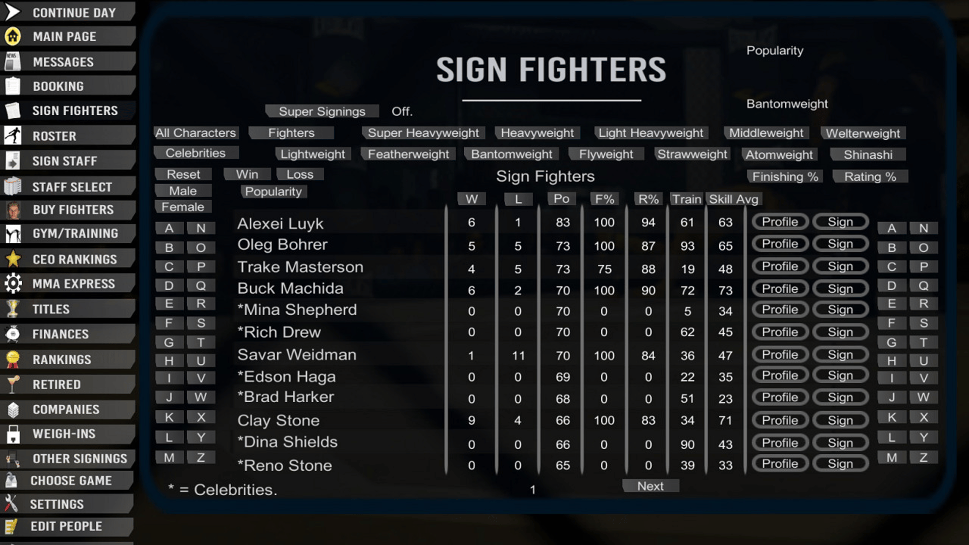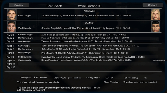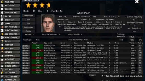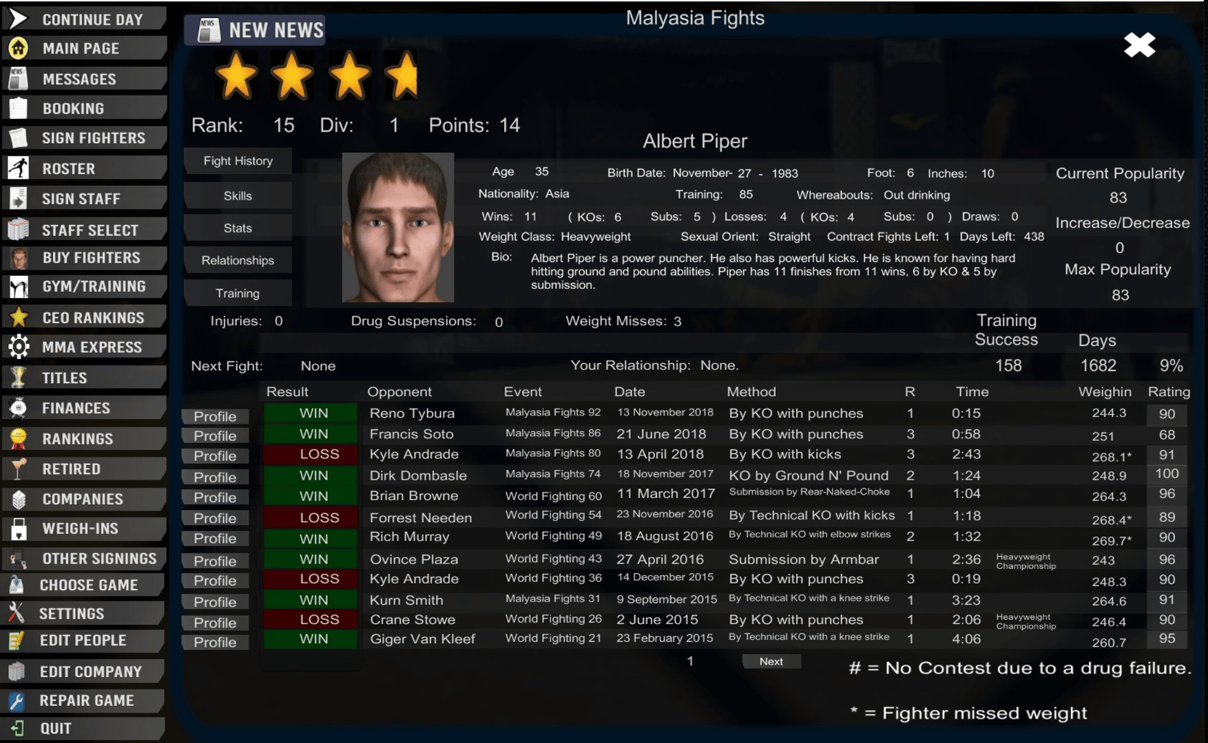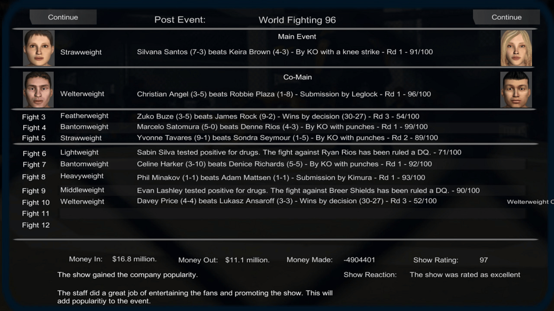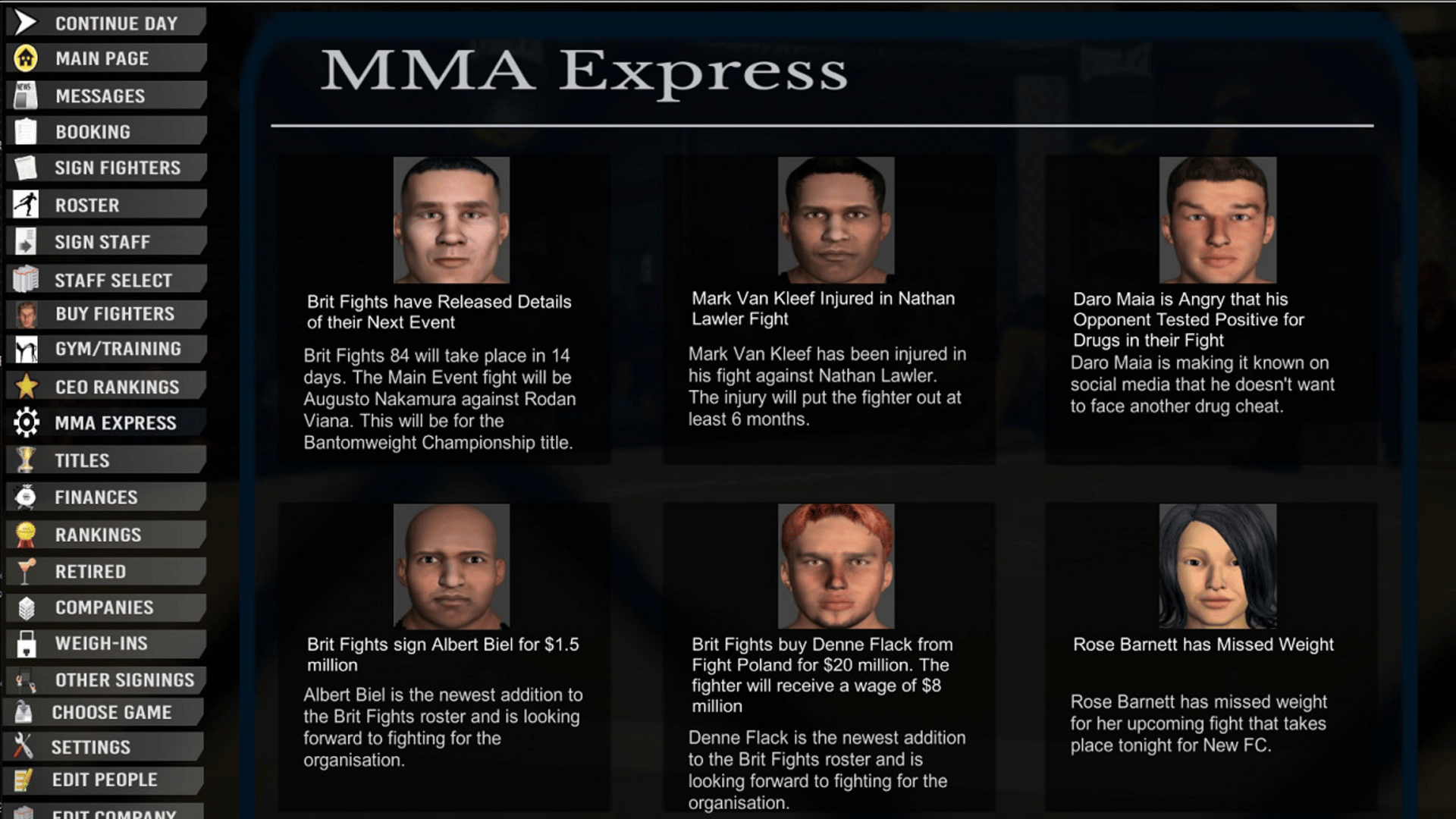 A Mixed Martial Arts (MMA) sports management game for the PC deskop/laptop. Run any of 25 different MMA companies and compete to become the best in the world. Find the next generation of MMA stars and watch them become legends in the sport.
