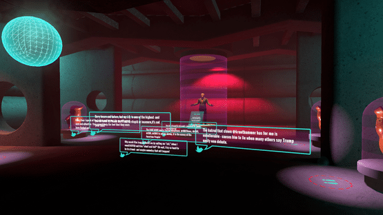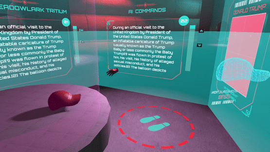 A satirical virtual reality experience that is based in a fictional future where the player can visit the Meadowlark Tritium museum’s exhibit "Trump & artefacts from a post-truth era". Featuring the "Tritium" voice activated museum AI system, a sonic tweet cloud, and an AI Trump.