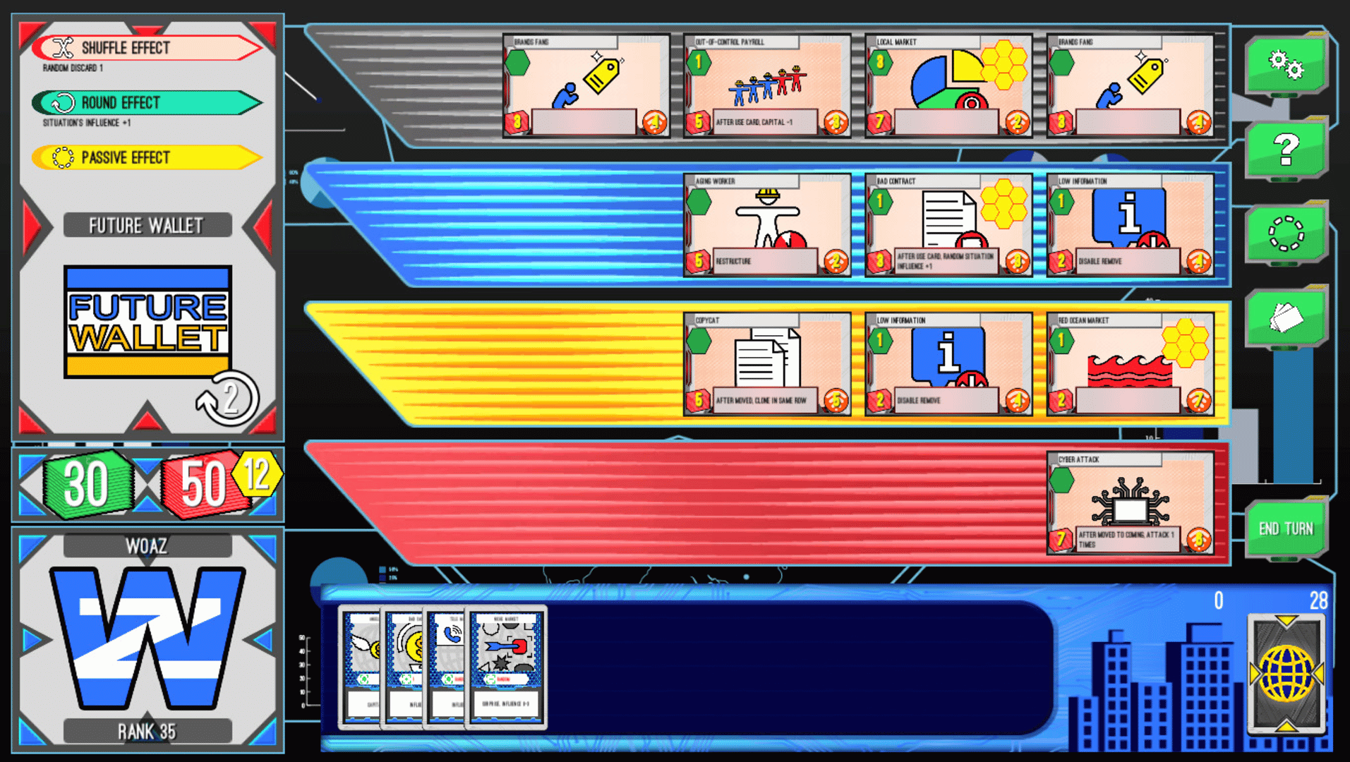 Business wars is a hardcore mix of strategy battles and business theory card game. Use your unique deck facing the business world situation, discover all possible strategy, and be the TOP 1 CEO in the business world!