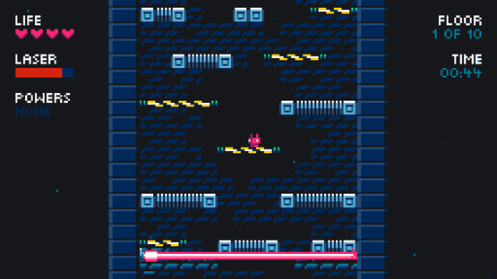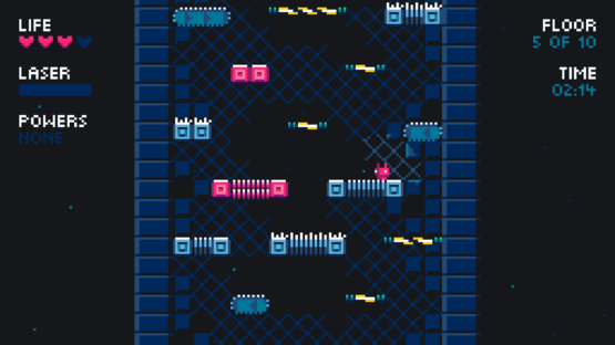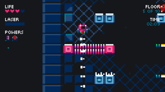 Droid7 is a platformer, jump your way up on a generated tower while a laser beam chases you from below. The higher you go, the faster it gets, and it isn’t long before disappearing (and reappearing) platforms and spikes are introduced to make your life harder. You gain score as you ascend, with your high score being saved.