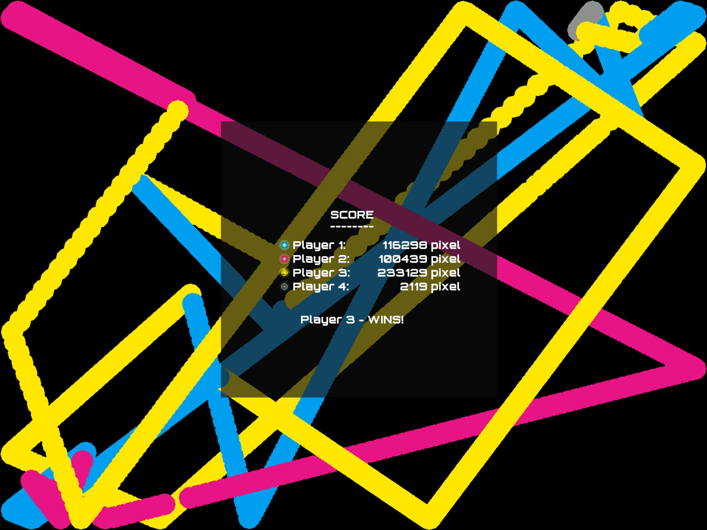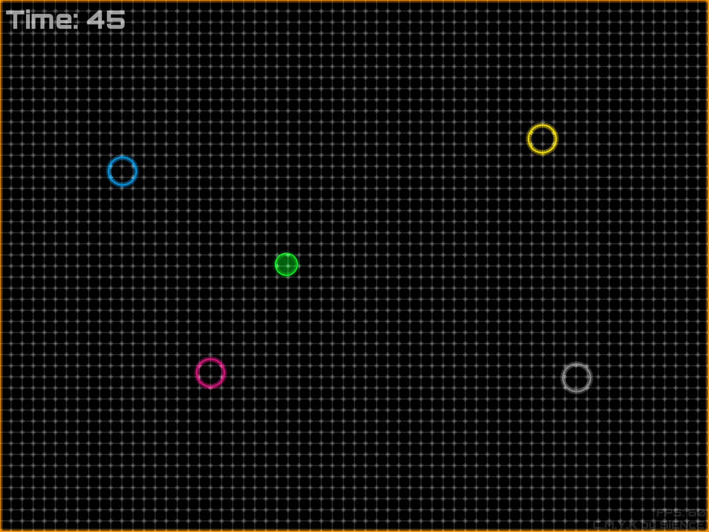 C.M.Y.K is a local 2-4 player game. Every player has a different colored light-disk and needs to push the green puck. Once pushed, the green puck paints the playfield with the color of the last touched light-disk. The player with the most colored pixels on screen wins.