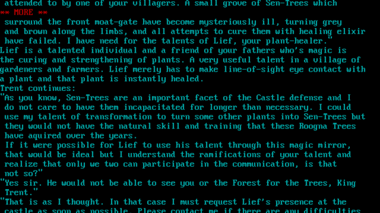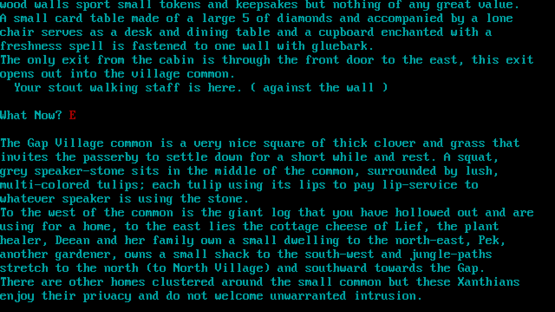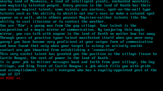 A Journey Into Xanth takes place in the magical world of Xanth known from the books of Piers Anthony. The game is a classic interactive-fiction game, with a text parser as the sole user interface. It was developed using a contemporary toolkit (Adventure Game Toolkit v1.3). You are playing a young man named Mim. Like all inhabitants of Xanth, Mim has a unique magical ability, the so-called talent. In his case he is able to conjure a magical mirror which can then be used to talk to any person he wants to, regardless of distance to that person. His talent makes him a quite important member of his local community, the Gap village. He serves as the villages' liaison to King Trent the ruler of the lands of Xanth, who resides in castle Roogna. Mim regularly corresponds with the King discussing various matters. This serves as the starting point for your adventure, as the latest communication with the King will result into a mission given to Mim.