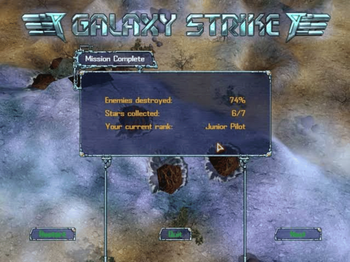 Galaxy Strike (also released as "Space Strike") is a scrolling space shooter. Using your mouse or keyboard, you must make your way through the enemy, killing them as you go. The enemy come at you in continuous waves through twenty progressively harder missions. You begin with an impulse gun. As you progress, you can pick up items to upgrade your impulse gun or even upgrade to a more powerful quantum laser or wave gun. You will also pick up secondary weapons like heat seeking missiles, the annihilator cannon or a nuclear bomb.