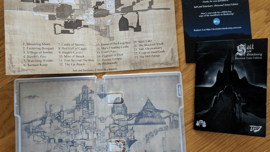 A physical version of Salt and Sanctuary released for the Nintendo Switch. It includes a Nintendo Switch game cartridge, a full manual, a double-sided mini poster featuring the Sodden Knight on one side and a hand-drawn world map of the island on the other, and a download code for the Salt and Sanctuary original soundtrack.