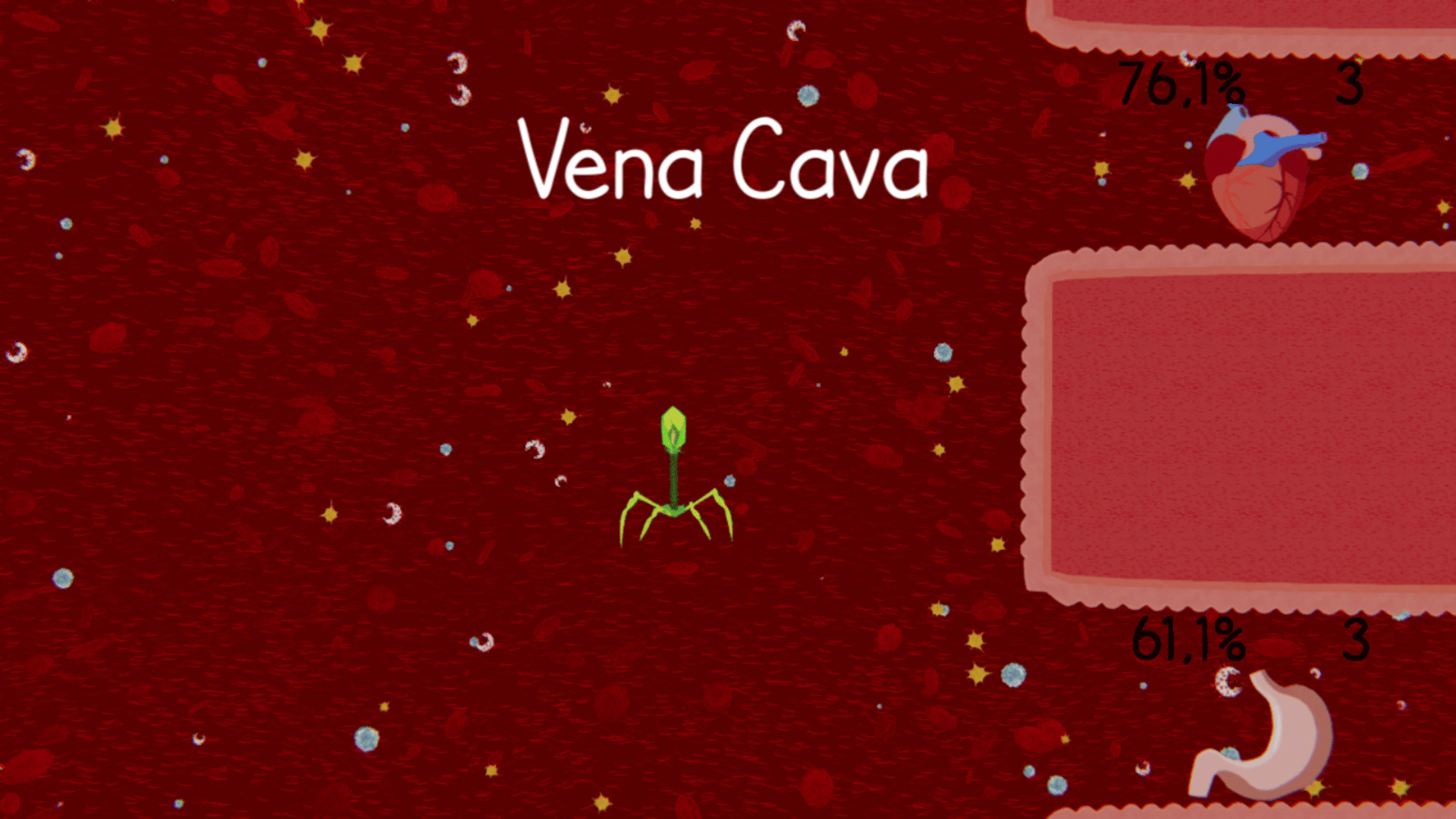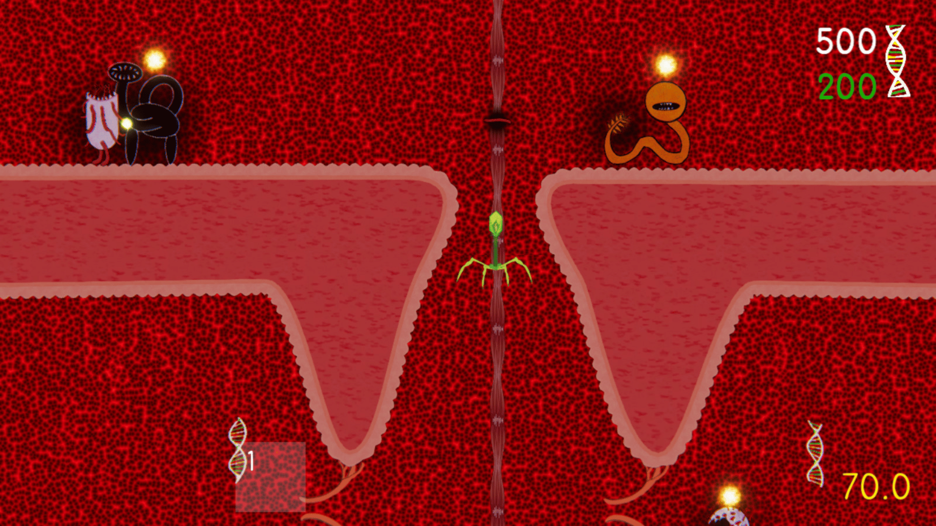 Hardcore adventure inside the human body. You take control of one bacteriophage, which steals(farms) DNA resources from various viruses. Use this DNA to evolve or create clones with which you can change positions at any time. Used wisely, you may cure all 5 organs.