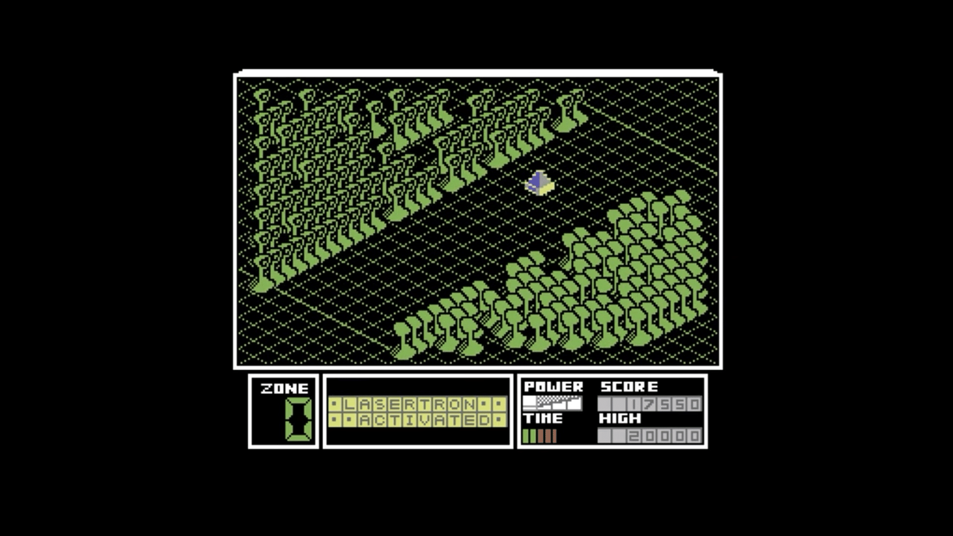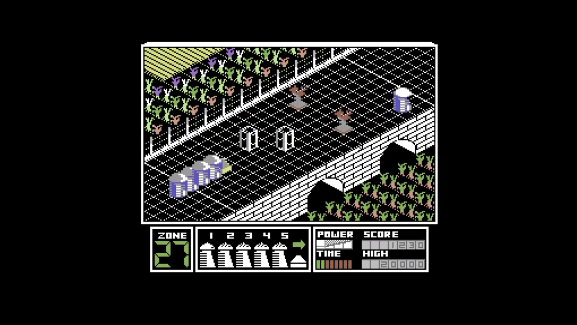 Highway Encounter is a strategy/action game played from a 3D isometric perspective in which you must successfully chaperone a bomb along a long, straight stretch of highway and into the alien base at the end of it. There are thirty screens to pass through and most are filled with hazards that threaten to block your progress (such as barrels) or destroy you (aliens and explosive mines). Players control a robotic "Vorton" (resembling a dalek from Doctor Who) and one of the things that provides Highway Encounter with its unique appeal is that the bomb is constantly being pushed onwards by your extra lives - four more Vortons, who accompany you along the highway. A key strategic element to the game is for the player character to travel several screens ahead of the bomb to clear a safe path for it; normally this would be done by temporarily blocking the bomb's forward motion. However, if the bomb is left in an unsafe location, it is possible for all your extra lives to be lost without the player character being destroyed once. Once all spare lives are lost, the player character must manually push the bomb.