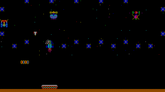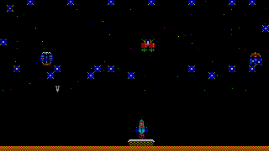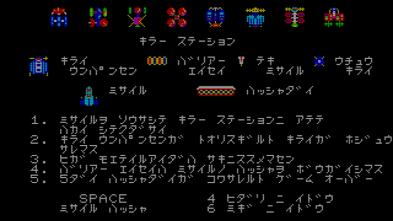 A Space Invaders-like game where you control a missile platform and shoot down "Killer Stations" while avoiding their missiles. The bad guys have "Barrier Satellites" and "Space Mines" to try to block your missiles from hitting them. Try your best to get all the killer stations to win the round and progress.